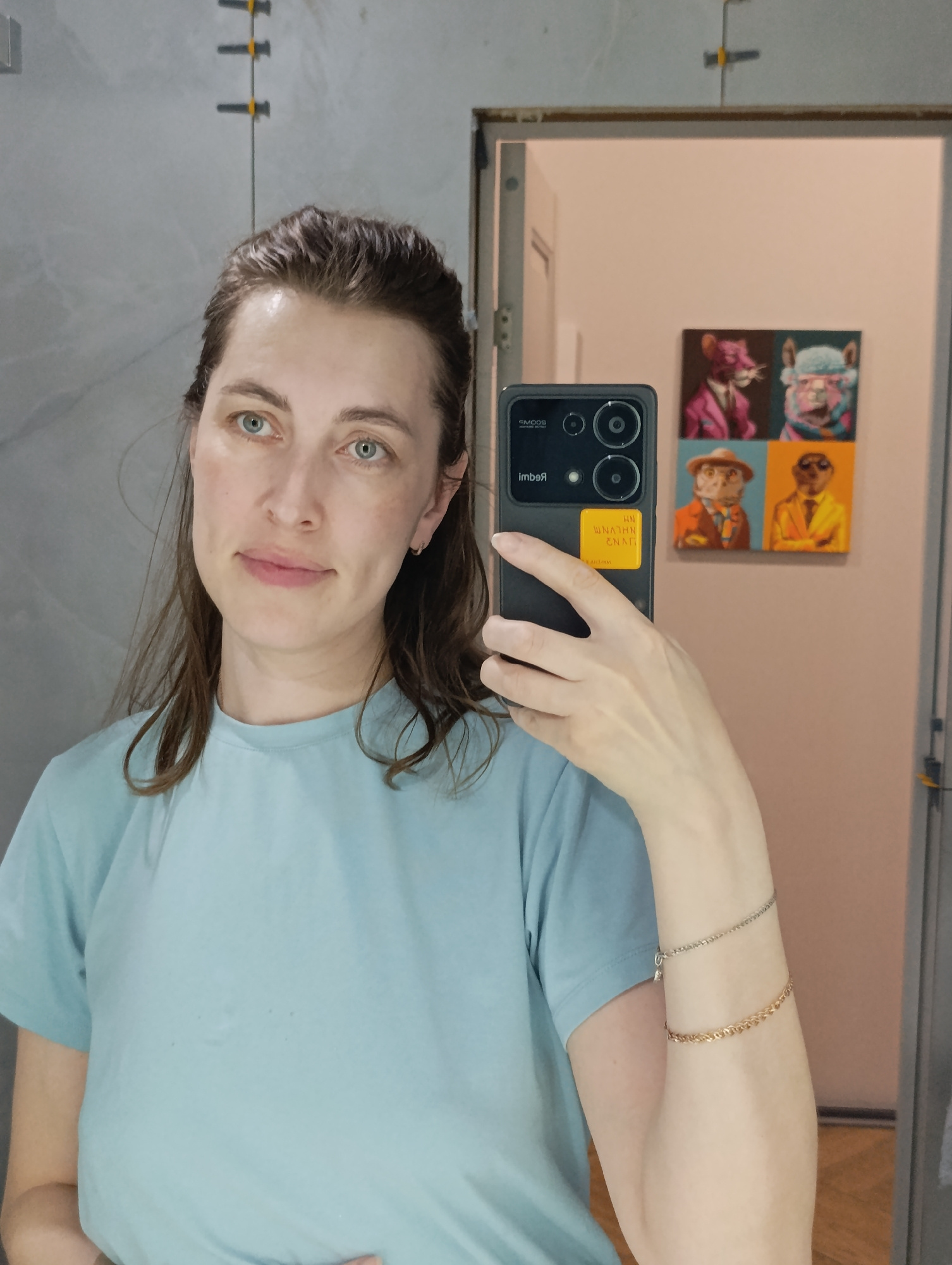 A woman is taking a selfie in a bathroom. She is wearing a light blue t-shirt and has two bracelets on her left arm. She is holding a black smartphone, and a yellow sticker is on the back of the phone…read more