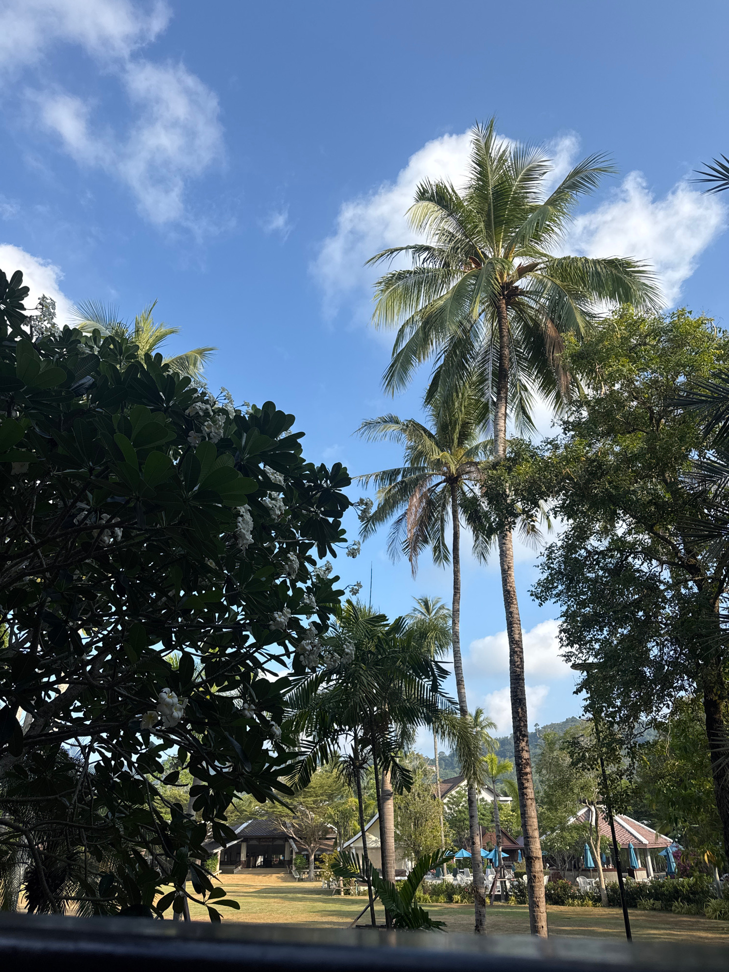 The image is a vertical shot taken from a low angle, looking upwards. The sky is predominantly blue with scattered white clouds. Several tall palm trees with green fronds extend into the sky. A large…read more