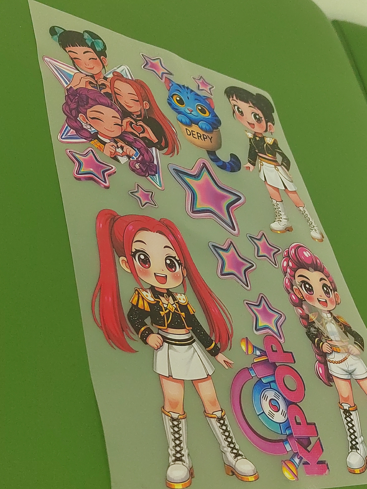 The image shows a sheet of stickers. The stickers depict cartoon-style figures resembling members of a K-pop group, stylized stars, and the word "K-POP" integrated into a graphic design resembling a mβ¦read more