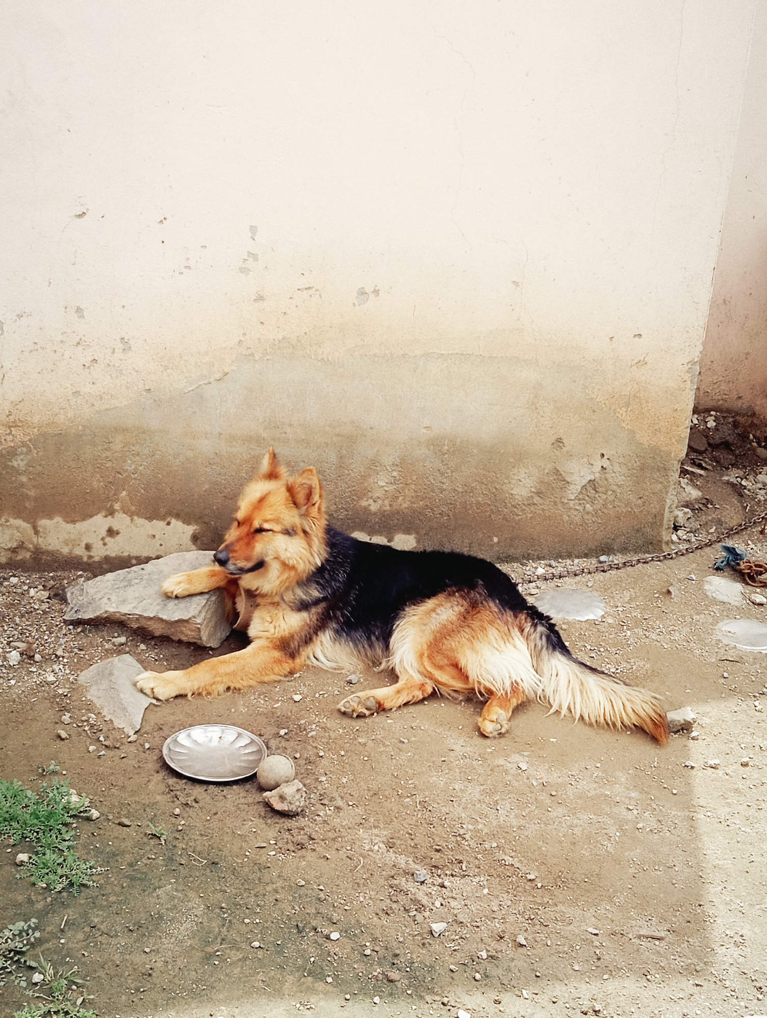 A medium-sized, long-haired dog, predominantly brown and black, lies on its side outdoors. The dog rests on a rough, uneven ground surface of dirt, gravel, and small rocks. Patches of green vegetation…read more