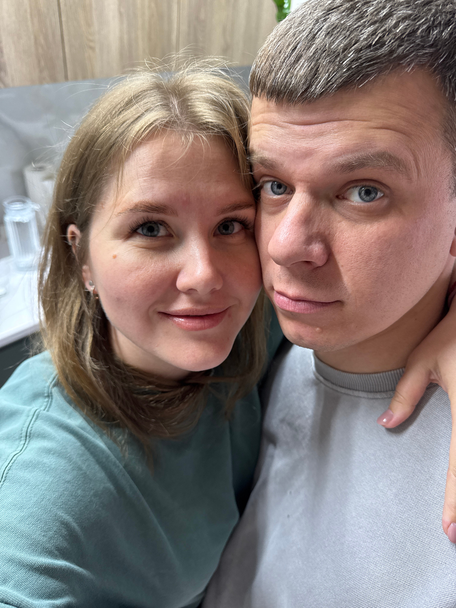 A close-up portrait features a man and a woman with their heads leaning together, both looking towards the camera. The man, positioned above and to the left, has short, salt-and-pepper hair and striki…read more