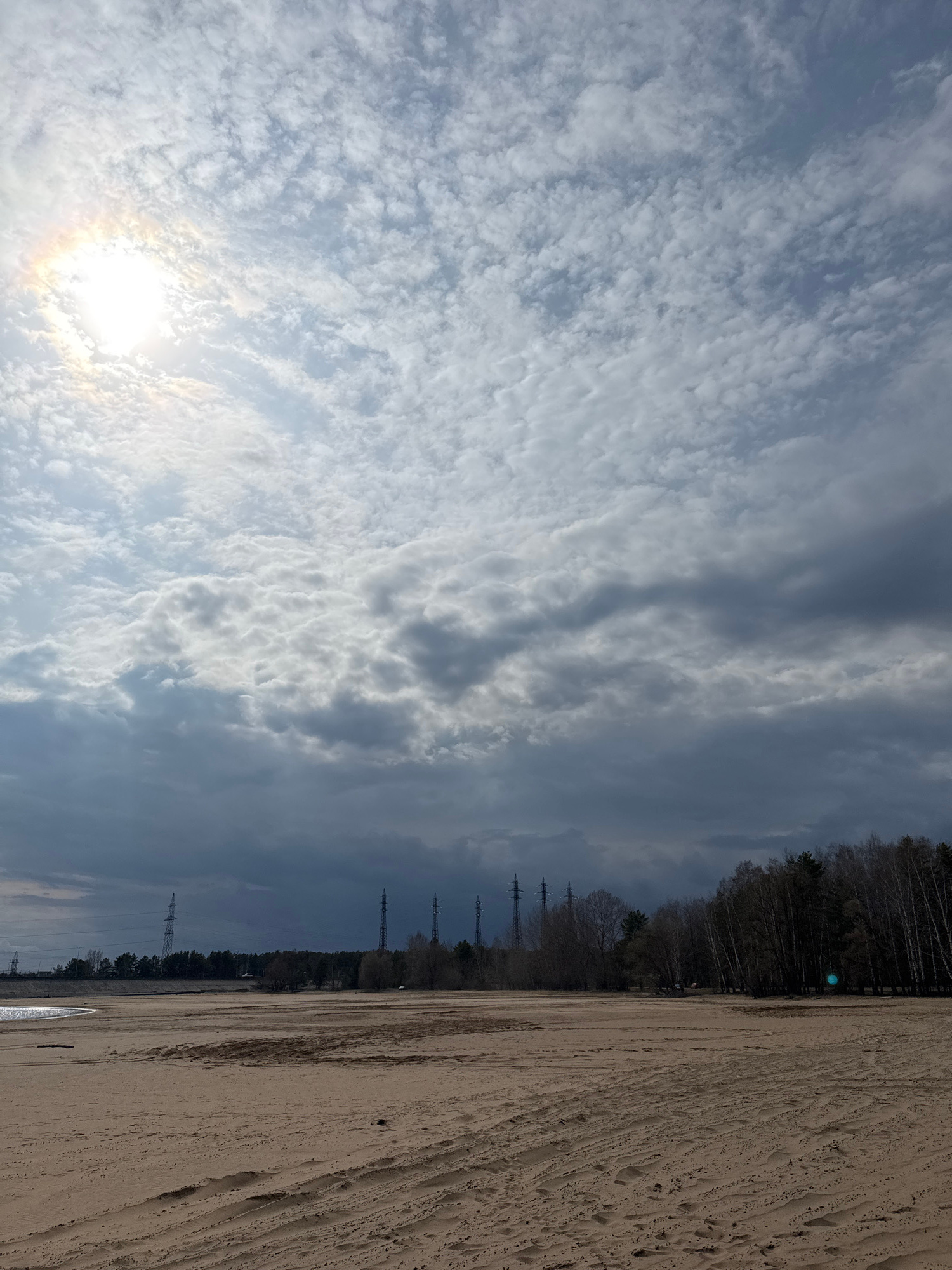 The image depicts a landscape scene in Noviy, Russia. The ground appears to be a sandy area, with visible tire tracks. A line of trees marks a boundary along the horizon. Beyond the trees, power lines…read more