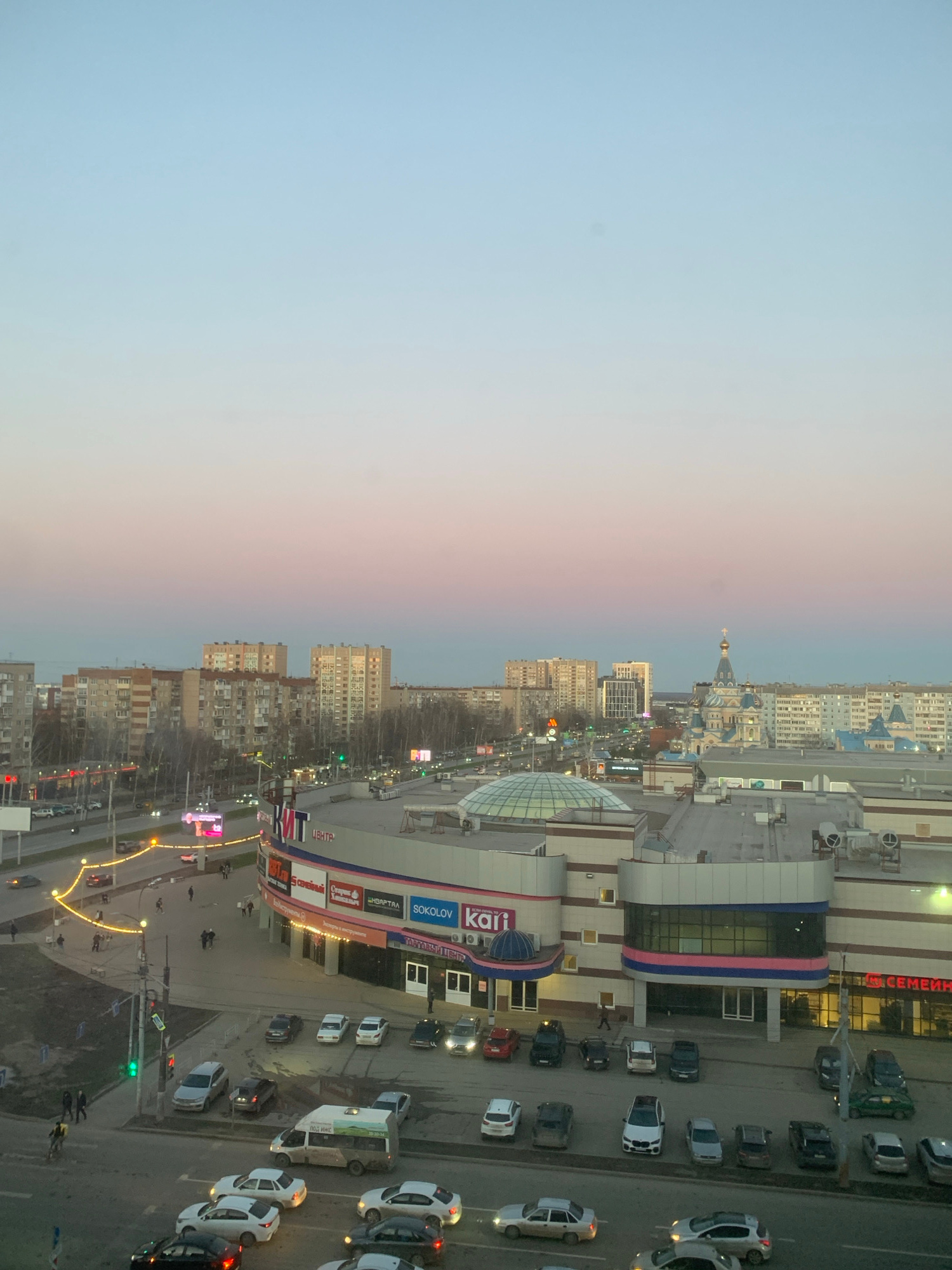The image shows a cityscape at dusk in Izhevsk, Russia. A pink and blue sky occupies the left side of the frame. To the right is a dense urban area featuring buildings of varying heights, including r…read more