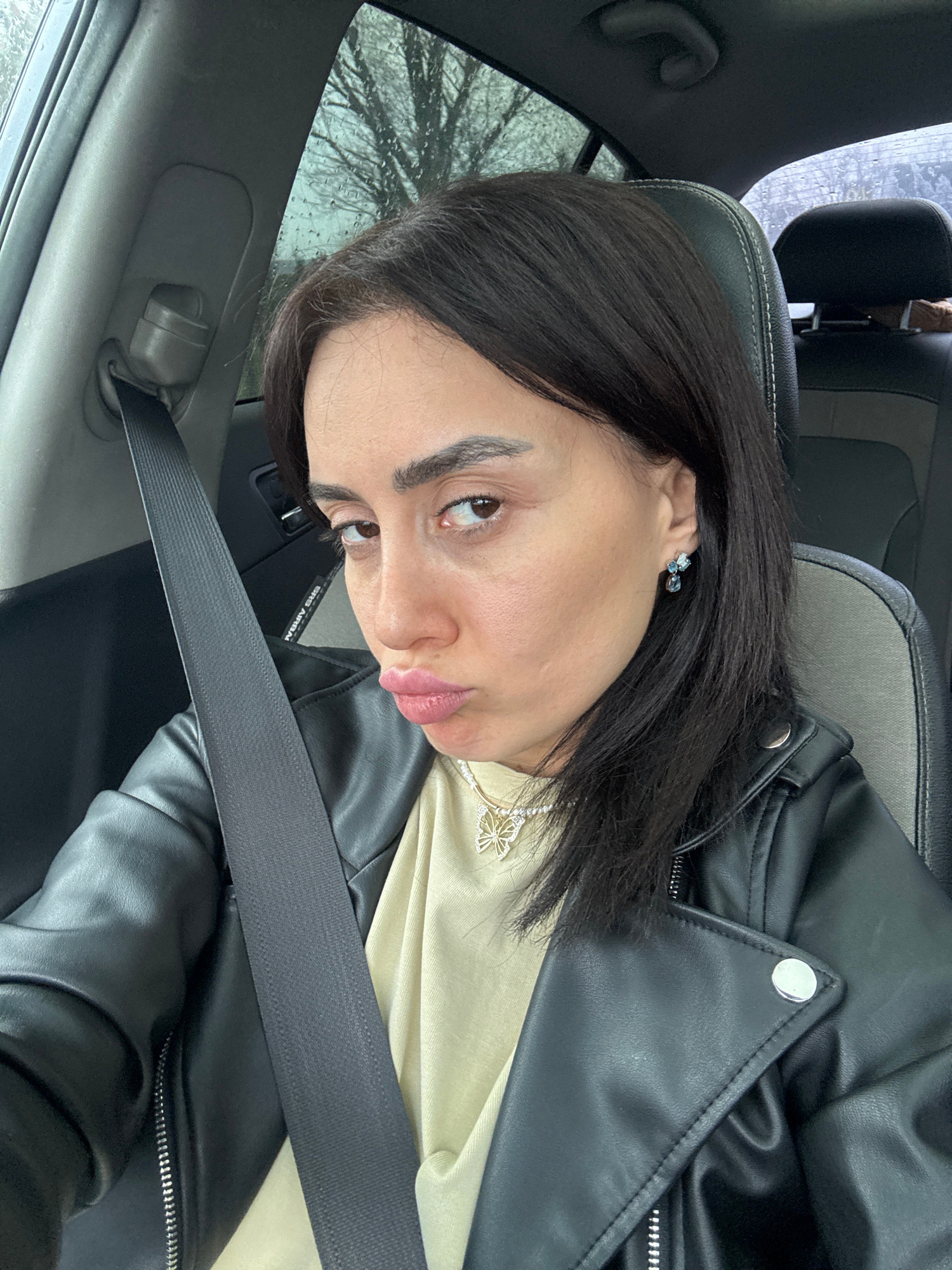 A female individual is depicted in the front passenger seat of a vehicle, secured by a black three-point seatbelt. She has dark hair, dark eyebrows, and brown eyes, looking towards the camera with pur…read more