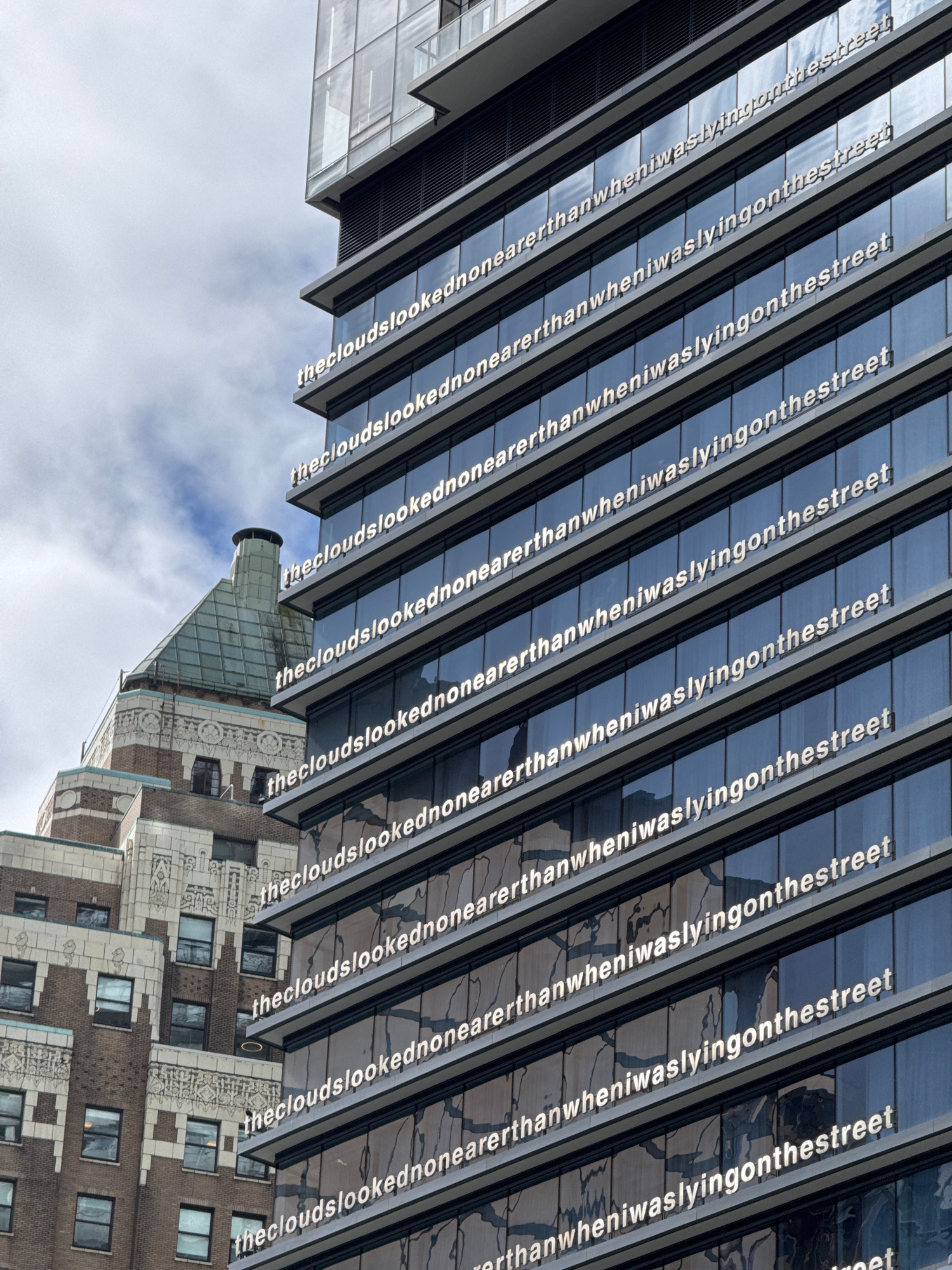 The image shows a section of a modern glass building with mirrored windows in Vancouver, Canada. The text "thecloudslookednonearerthanwheniwaslyingonthestreet" is printed on the glass panels. The refl…read more