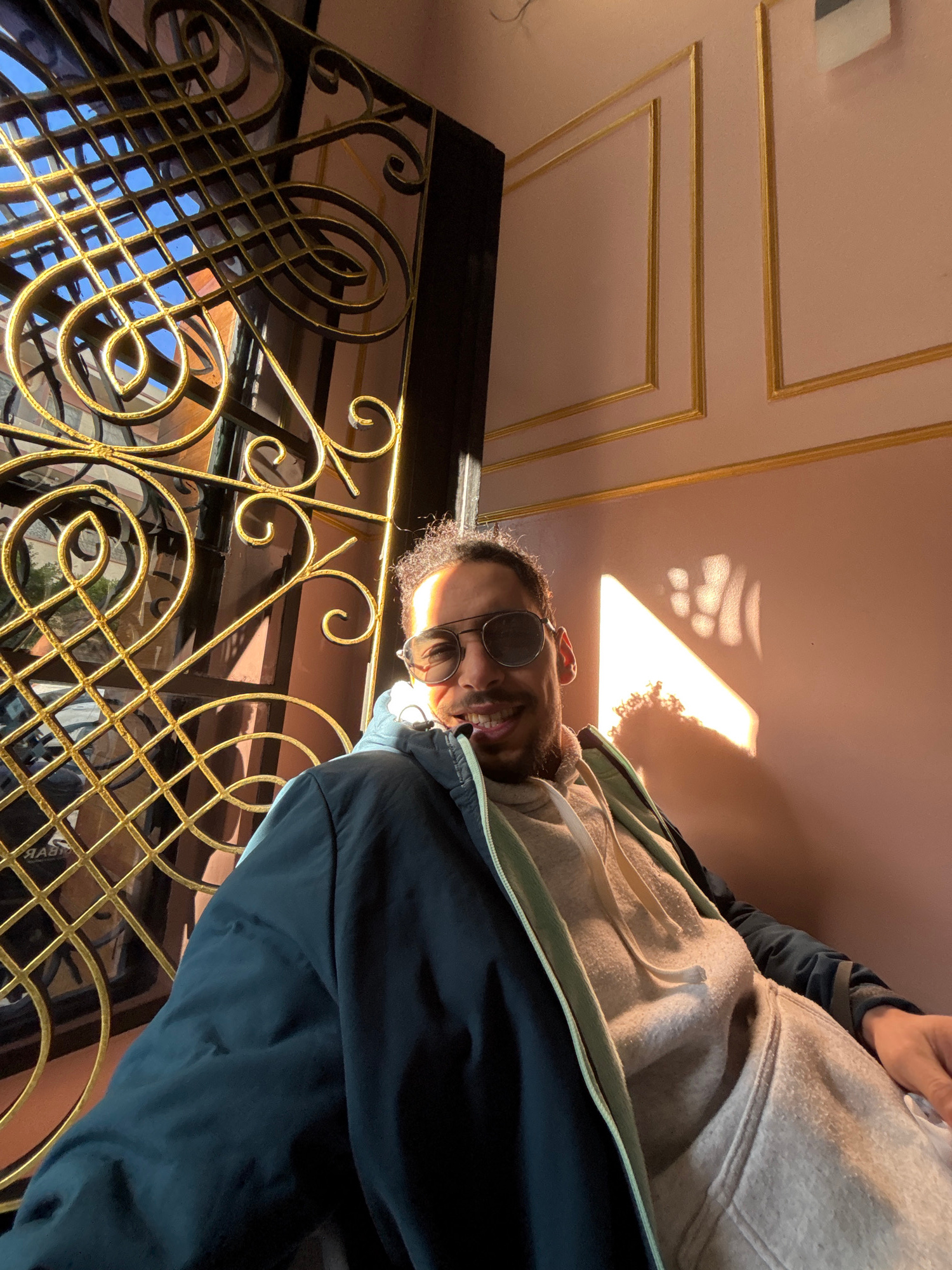 An adult male is depicted in a close-up, chest-up selfie-style photograph taken indoors in Tanger, Morocco. He is smiling directly at the camera, wearing dark aviator-style sunglasses, a dark blue zip…read more