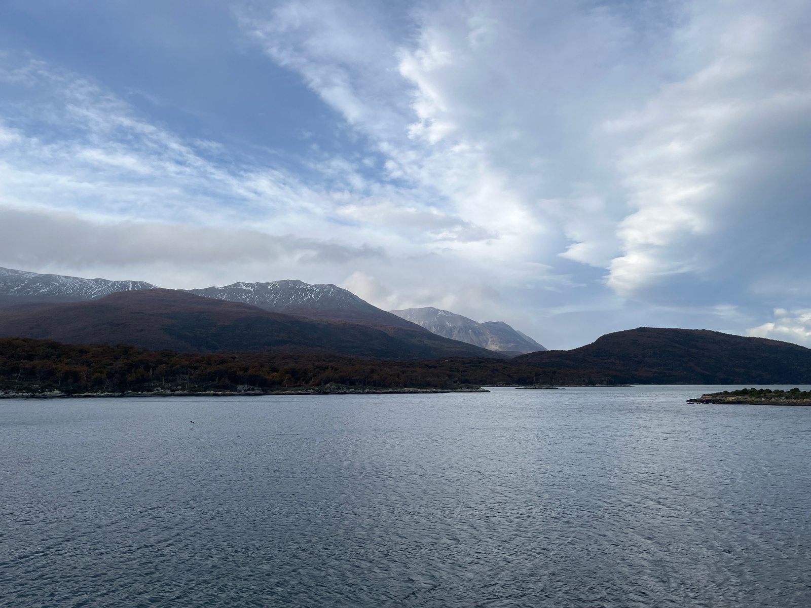 The image presents a wide body of water, possibly a lake or a sea inlet, reflecting the overcast sky. In the background, a chain of mountains is visible. Some of the peaks are capped with snow or ice.…read more