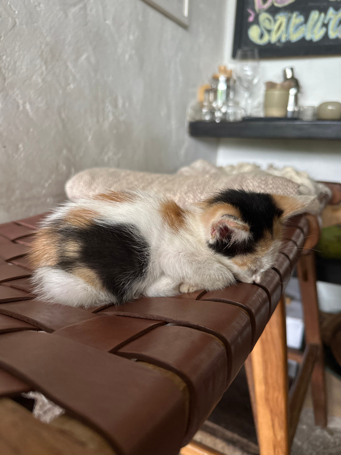 A small, calico kitten clings to a woven brown chair. The kitten's black, white, and orange fur is visible. Its back is toward the camera. A fluffy, light-colored cushion sits beneath the kitten. A co…read more