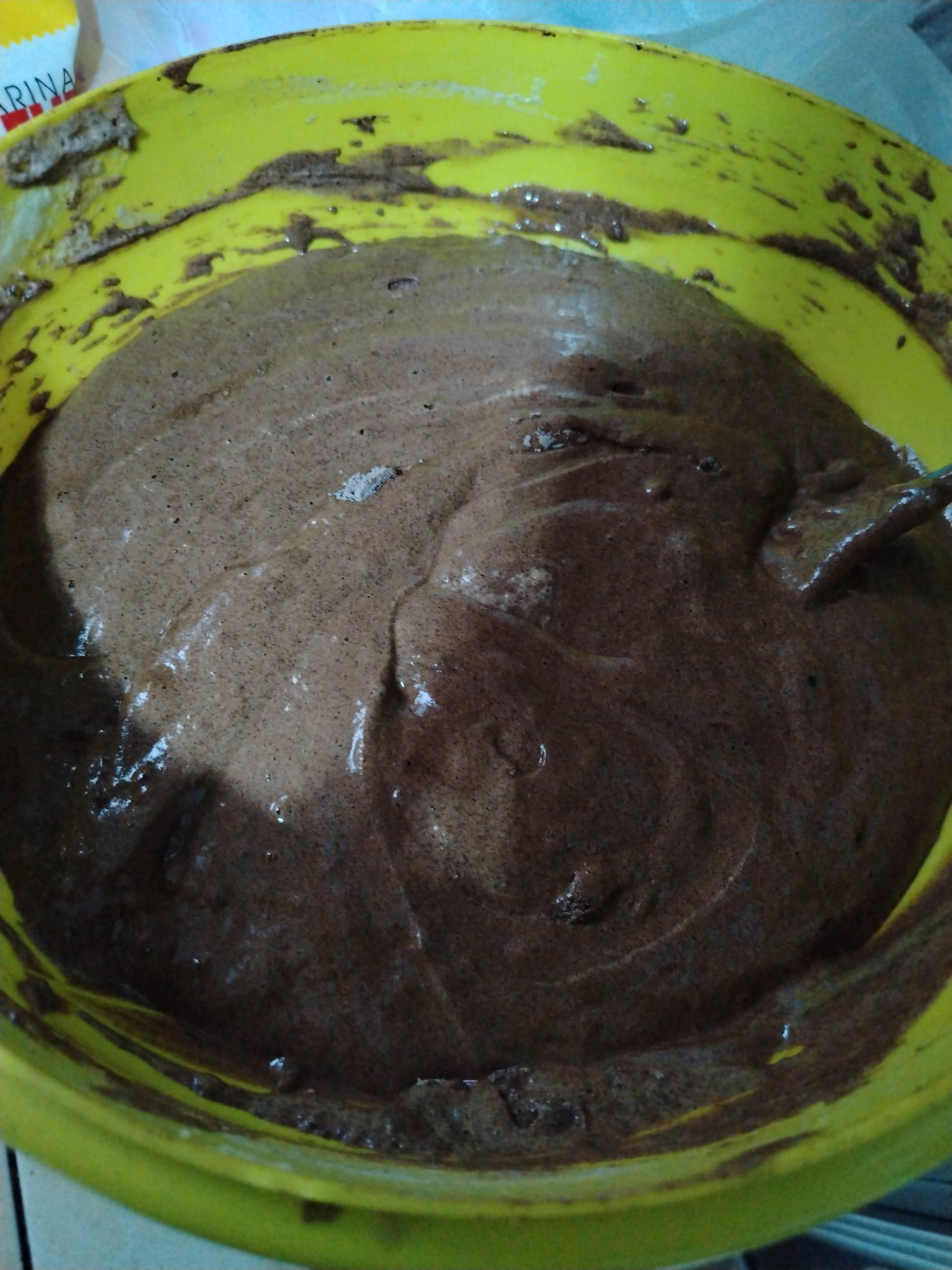 A close-up, eye-level shot of a yellow mixing bowl filled with dark brown batter, likely cake or brownie batter. The batter has a slightly shiny appearance and is somewhat uneven in texture, indicatin…read more