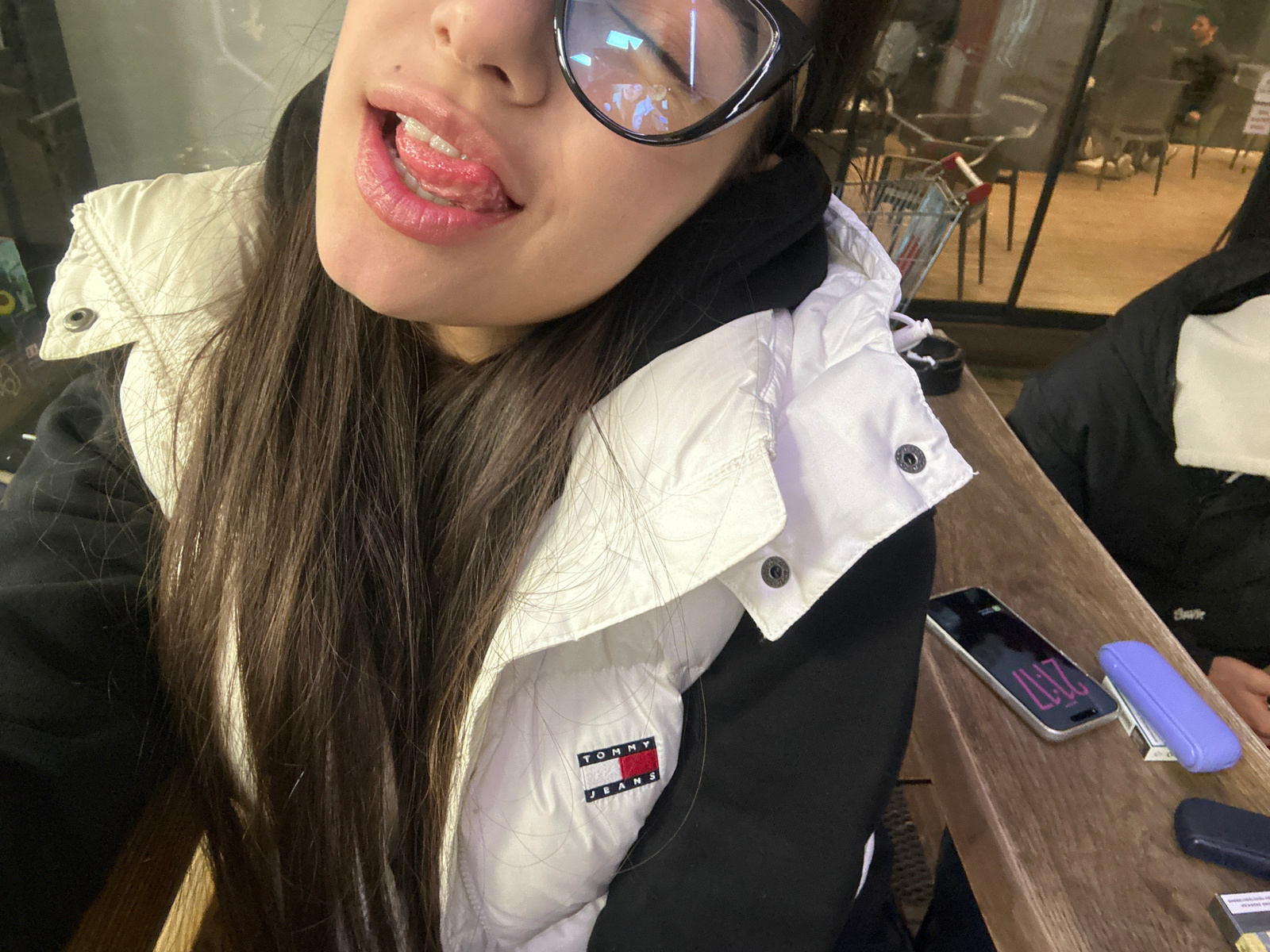 A rotated, close-up shot shows a person with long, dark hair and glasses. The person is wearing a white and black Tommy Jeans jacket. The person's tongue is visible. To the left, on a wooden surface,…read more