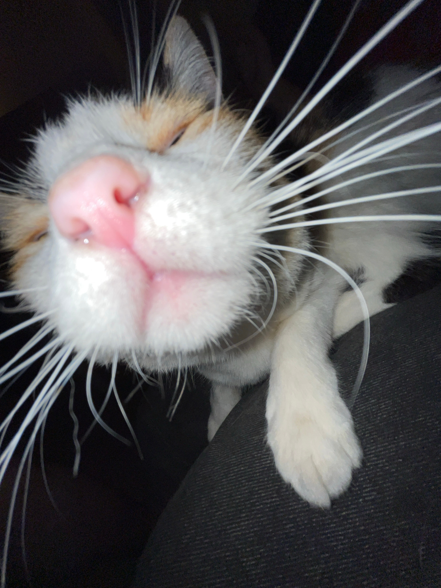 A close-up, low-angle shot focuses on a calico cat's face. The cat's nose is prominently displayed in the center, pink and slightly shiny. Many white whiskers radiate outwards from its face. One paw i…read more