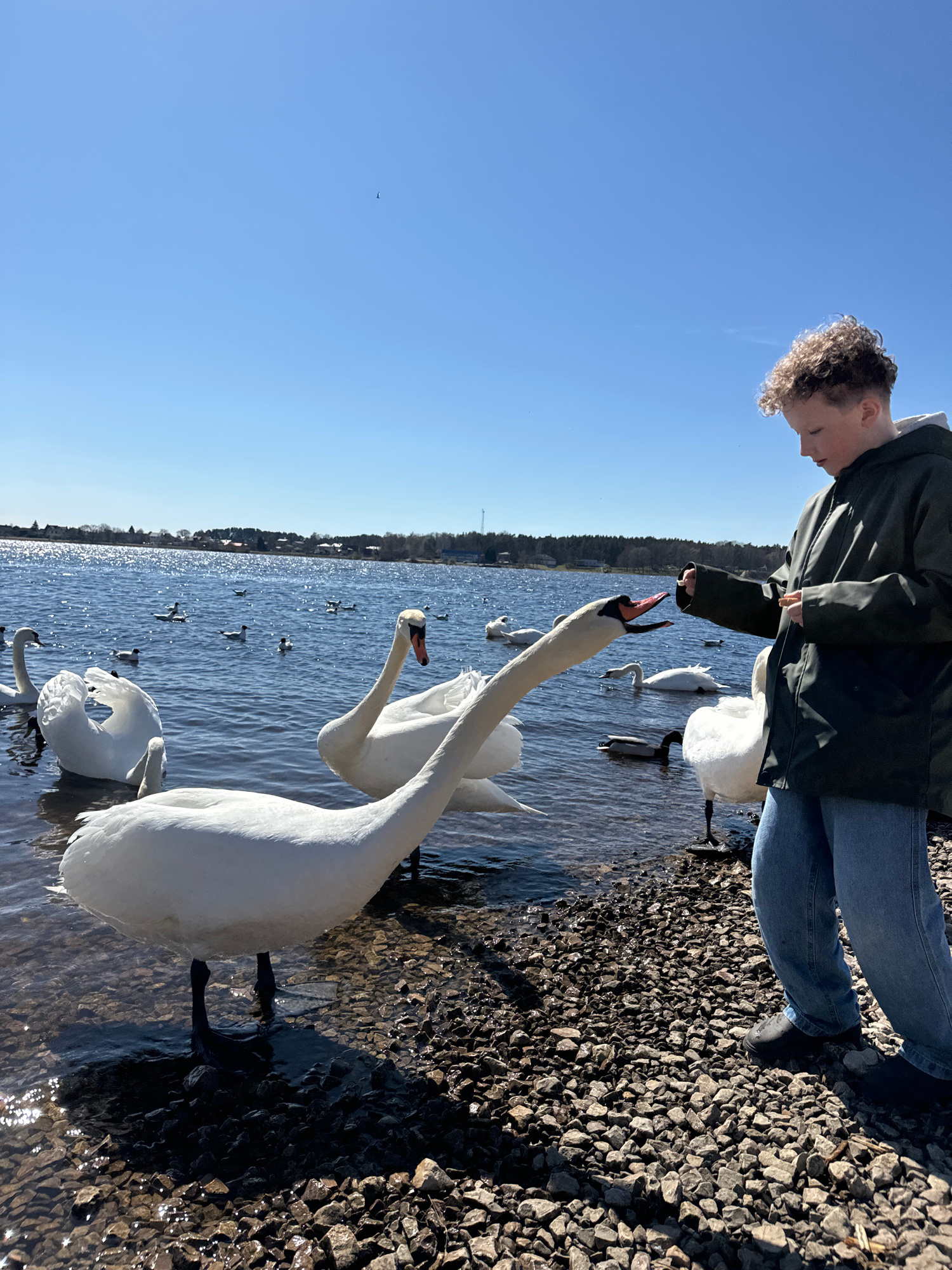 A daytime, outdoor scene shows a person feeding swans by the water, likely on the Daugava River in Riga, Latvia. The person, seen from the side, stands on a rocky shoreline wearing a dark green jacket…read more