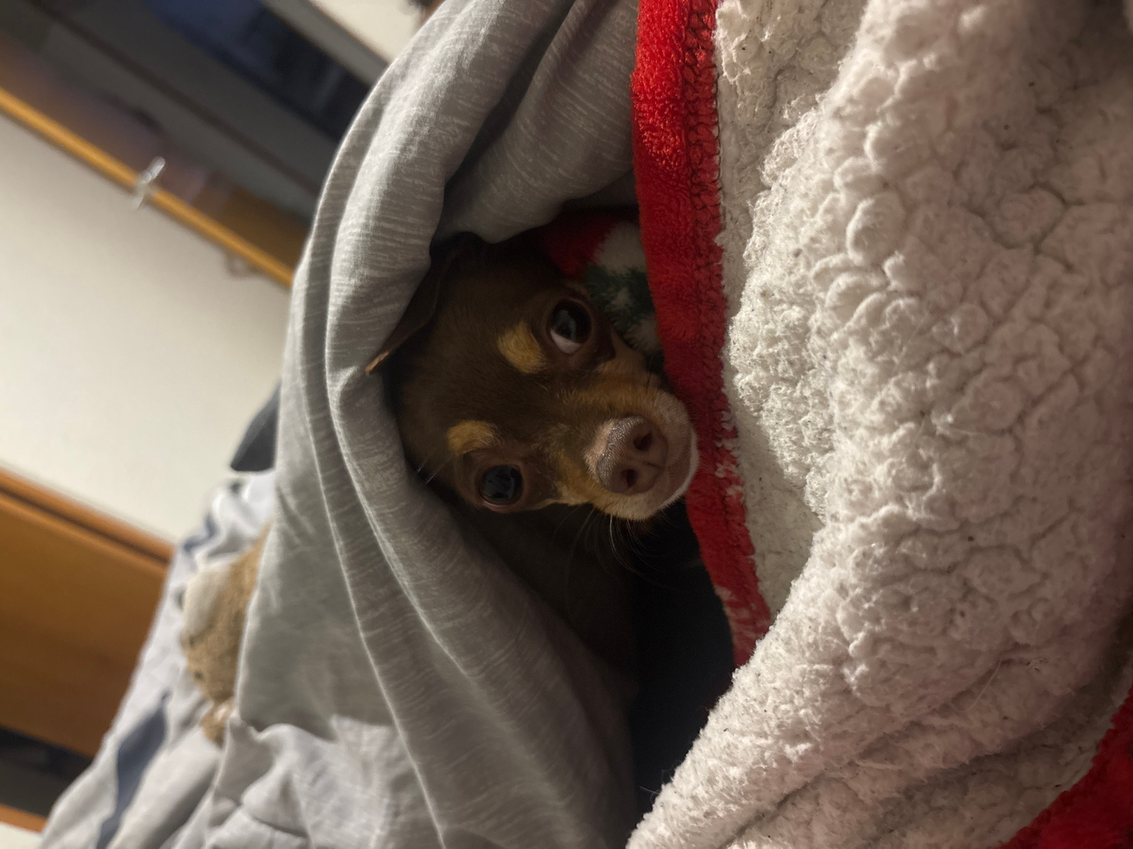 A small brown dog is partially concealed under a gray blanket and a white sherpa-lined blanket with a red edge. The dog is looking directly at the viewer with alert eyes. The environment appears to be…read more