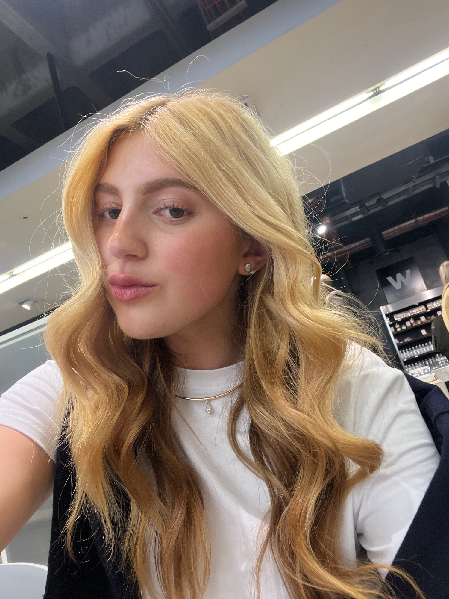 A medium shot of a blonde-haired woman is captured indoors. Her long, wavy hair cascades over her left shoulder. She is wearing a white t-shirt. An earring is visible in her left ear. A thin gold neckβ¦read more