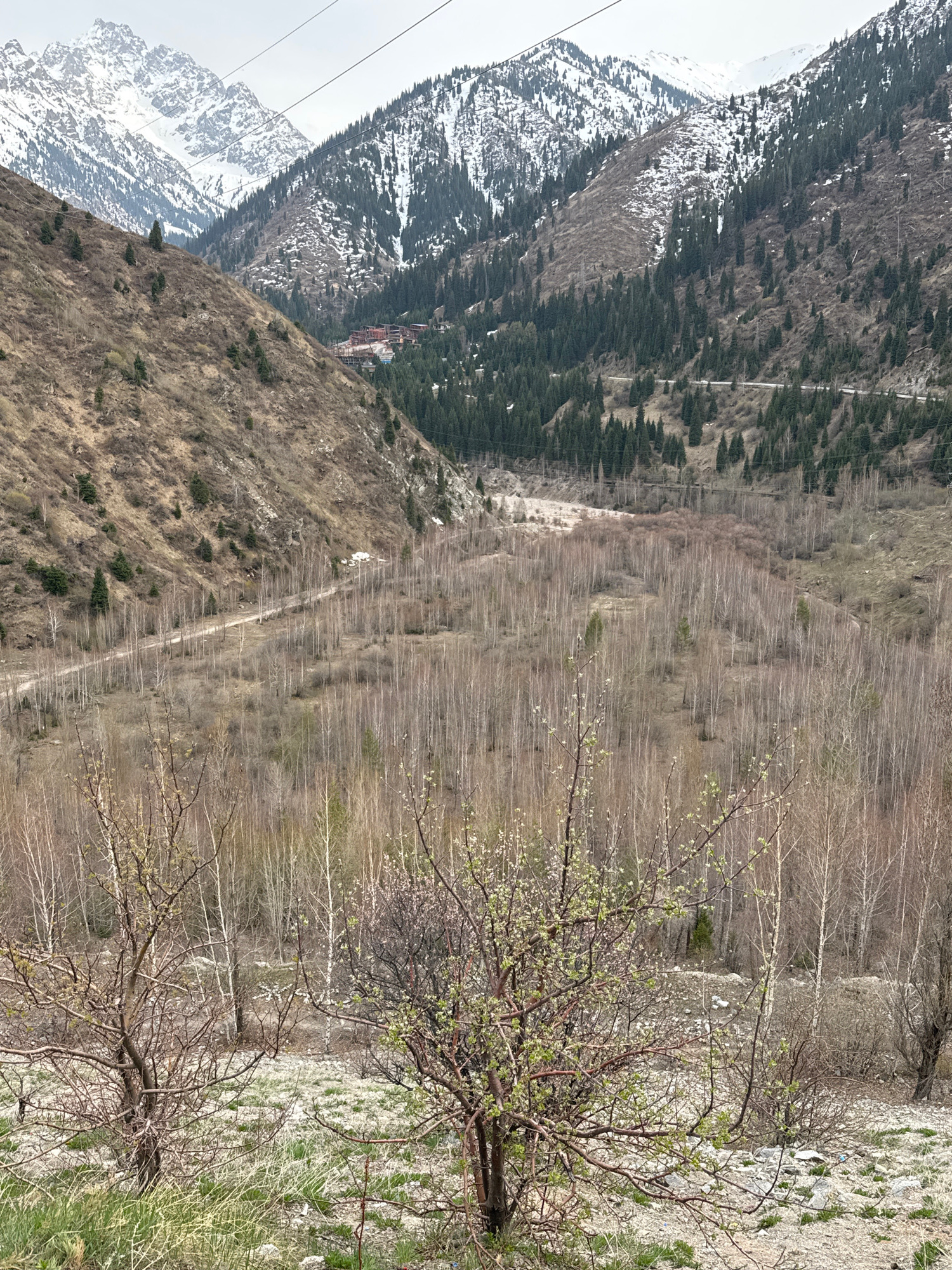 This image captures a panoramic view of a mountainous landscape, likely in the early spring near Almaty, Kazakhstan. In the background, majestic snow-capped mountains rise under an overcast sky, with…read more