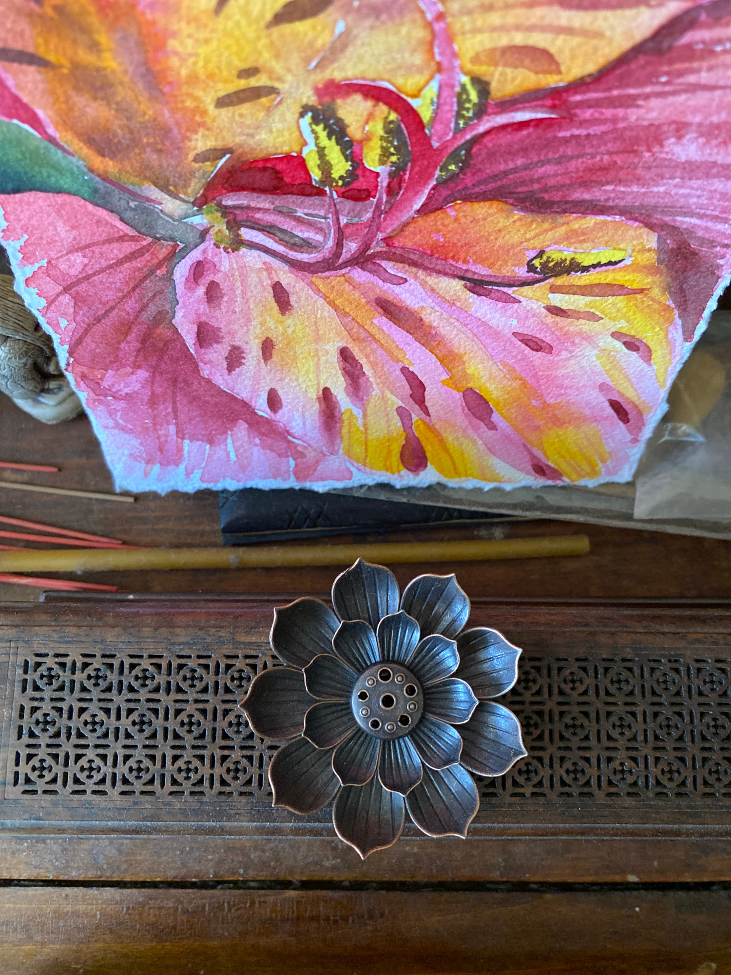 The image presents a still life arrangement on a dark wooden surface. To the left, there's a watercolor painting of a flower, predominantly in shades of red, yellow, and pink. The painting appears unf…read more
