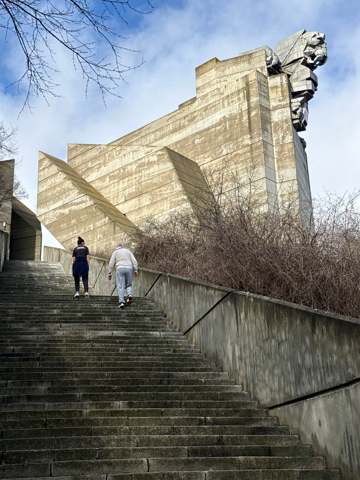The image displays the Monument to 1300 Years of Bulgaria, also known as the Founders of the Bulgarian State Monument, located on Shumen Plateau in Shumen, Bulgaria. The central focus is a massive, an…read more