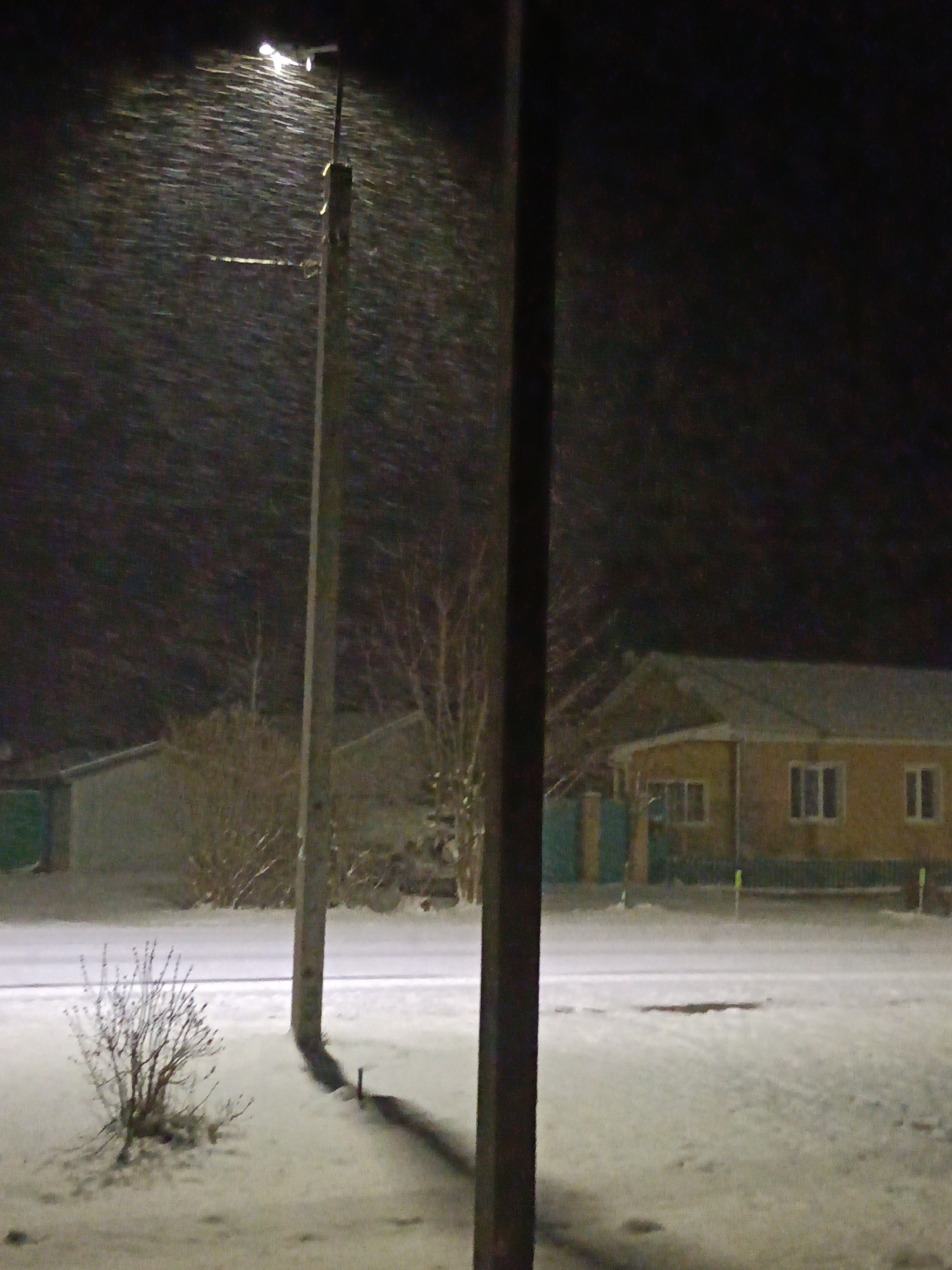 The image depicts a snowy night scene in Красный Маяк, Russia. A streetlight illuminates falling snow near a wooden utility pole. A snow-covered street and yard are visible, with a small, leafless bus…read more