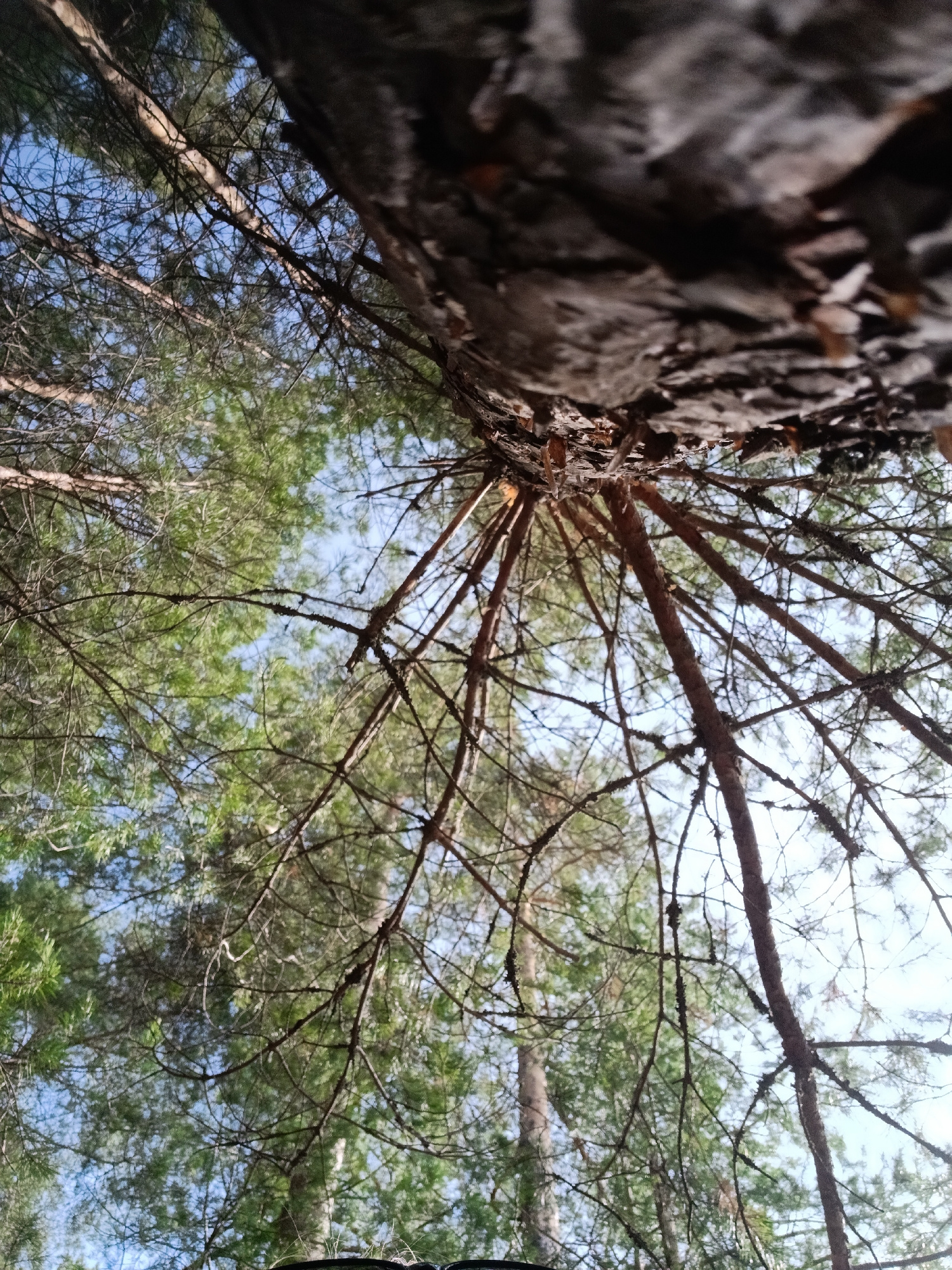 The image is a low-angle perspective looking up into the canopy of trees, possibly in a forest. The foreground is dominated by the rough bark of a tree trunk, which is out of focus. Radiating outwards…read more