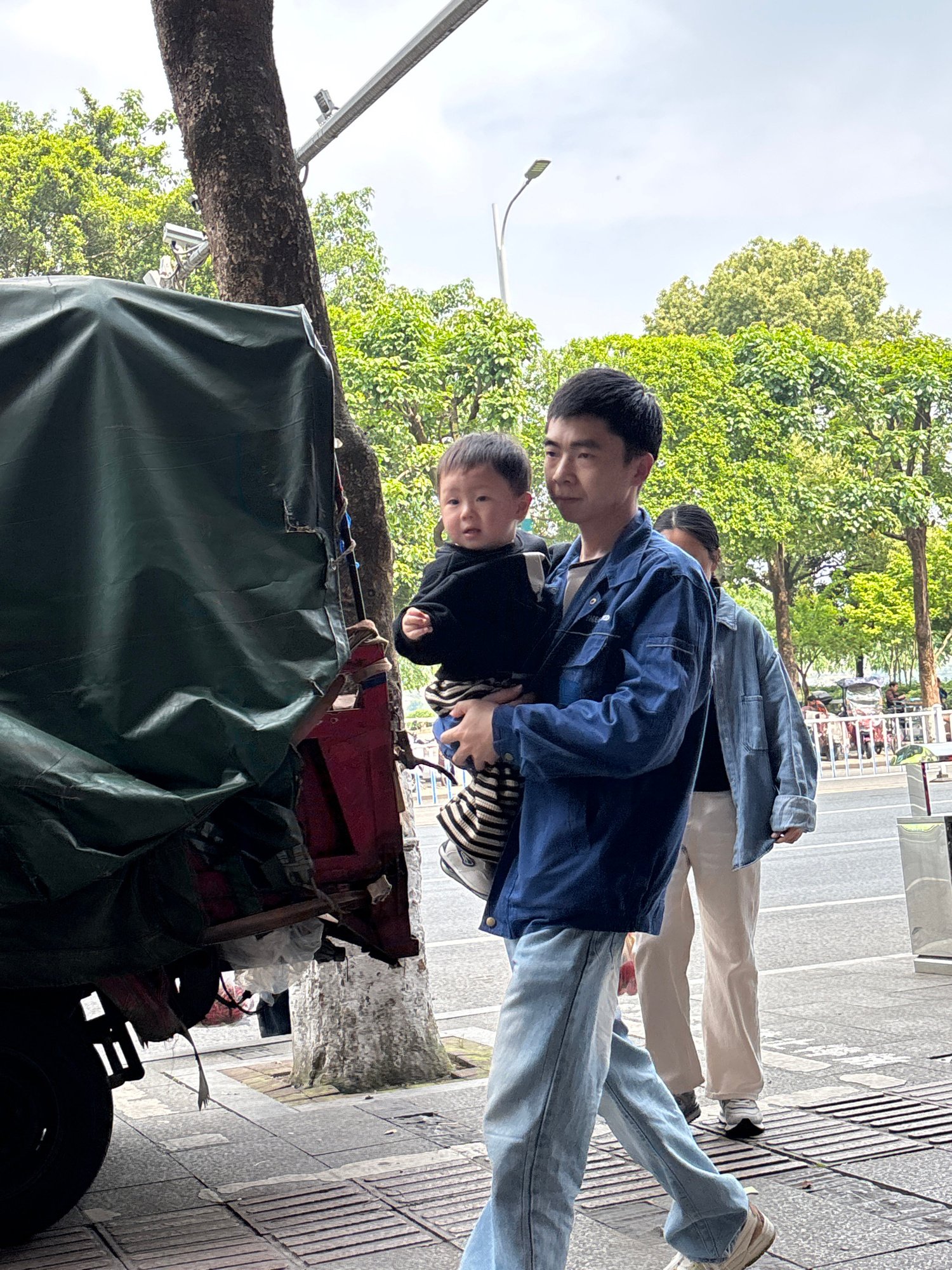 The photograph depicts a man carrying a young child, likely a toddler, on a sidewalk adjacent to a city street. The man is wearing a blue denim jacket and light-wash jeans. The child is wearing a dark…read more