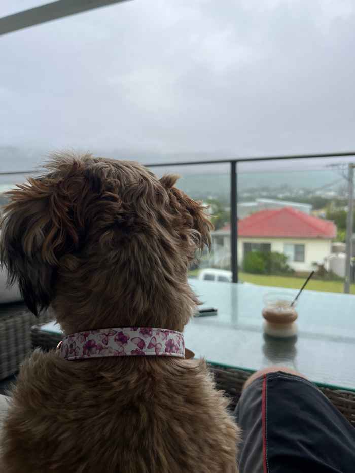 A medium-sized, brown, curly-haired dog with a white collar patterned with pink butterflies looks out a window. Outside, the sky is overcast and buildings with red roofs are visible. A clear glass tab…read more