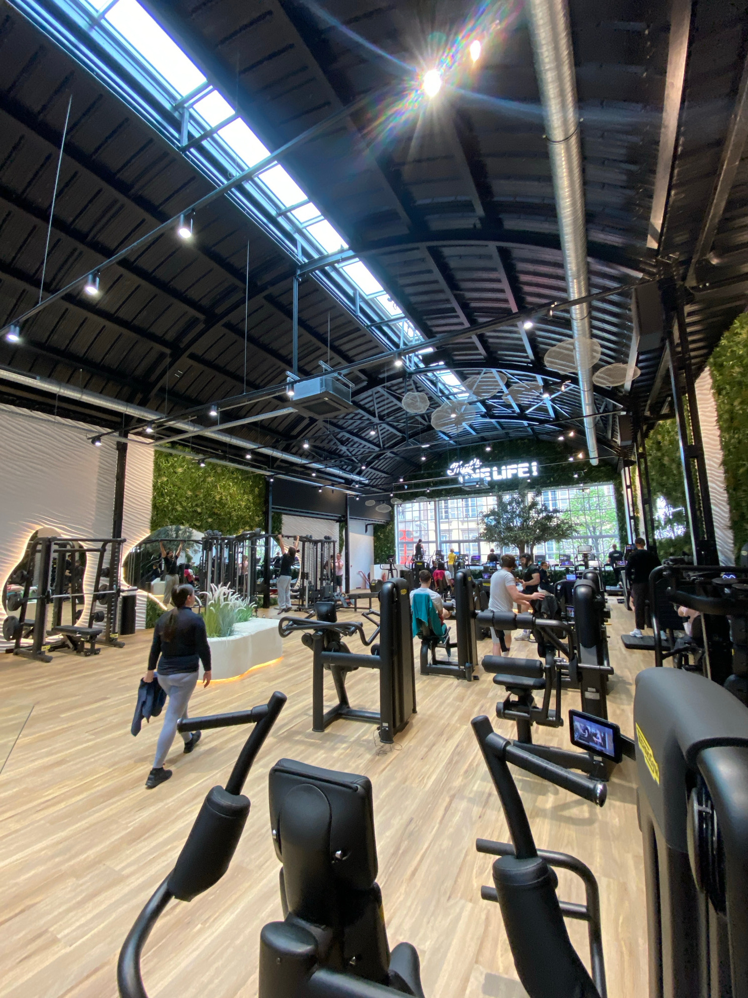 The image shows the interior of a well-lit gym, likely in Strasbourg, France. The gym features rows of modern exercise machines. Several people are exercising on the equipment. The ceiling has a blackβ¦read more