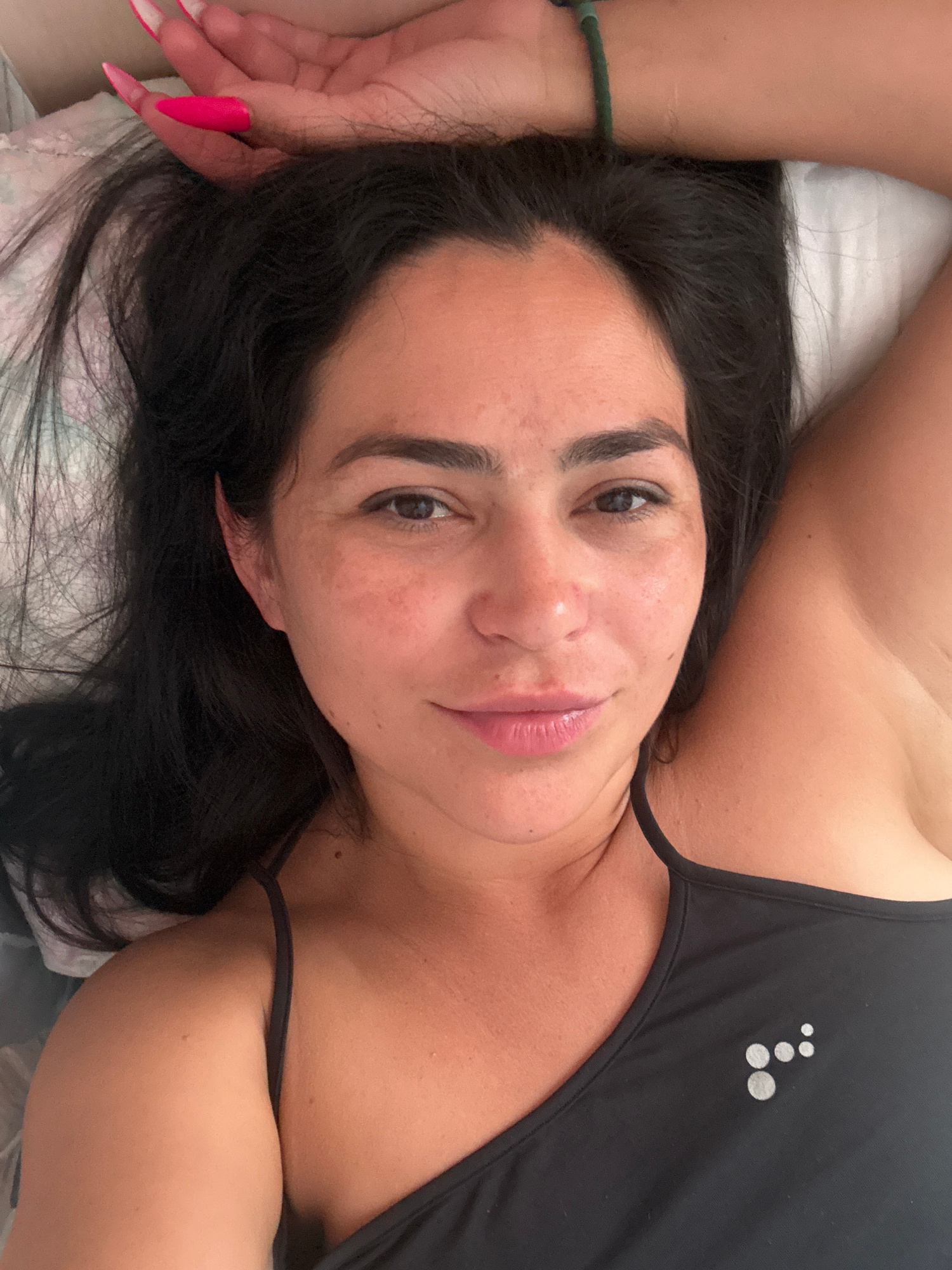 A woman lies on a bed. She has dark hair, and is wearing a black tank top. Her left arm is bent with her wrist above her head. Her nails are bright pink. She is likely indoors, on a pillow, and lookin…read more