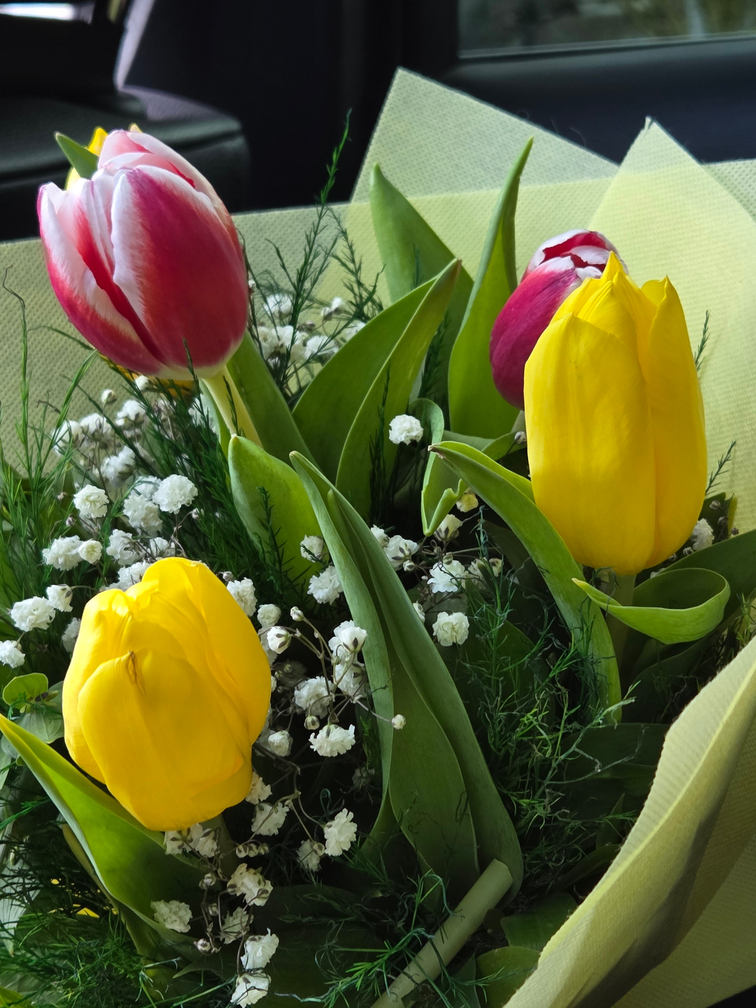 The image shows a close-up of a bouquet of flowers. There are two prominent tulips, one yellow and one with red and white petals. Small white flowers, possibly baby's breath, are interspersed througho…read more