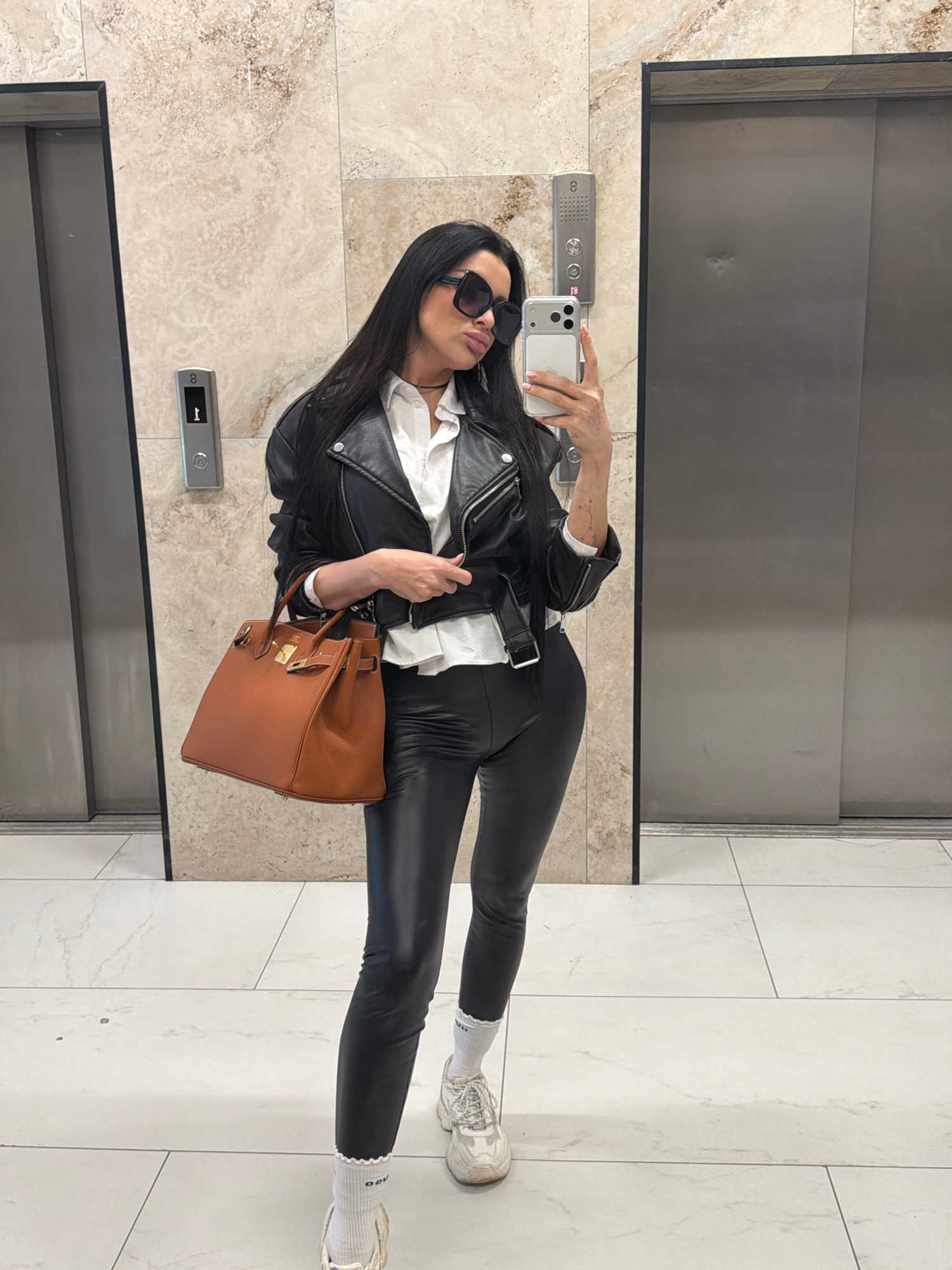 A woman wearing a black leather jacket, white shirt, black leather pants, white socks, and sneakers is taking a selfie in a mirror inside an elevator. She is also wearing sunglasses and carrying a broβ¦read more