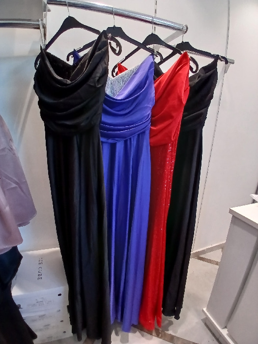 An interior view depicts a retail clothing display within a commercial establishment in Tel-Aviv, Israel. Four full-length formal dresses, likely evening gowns, are suspended from a horizontal silver-…read more