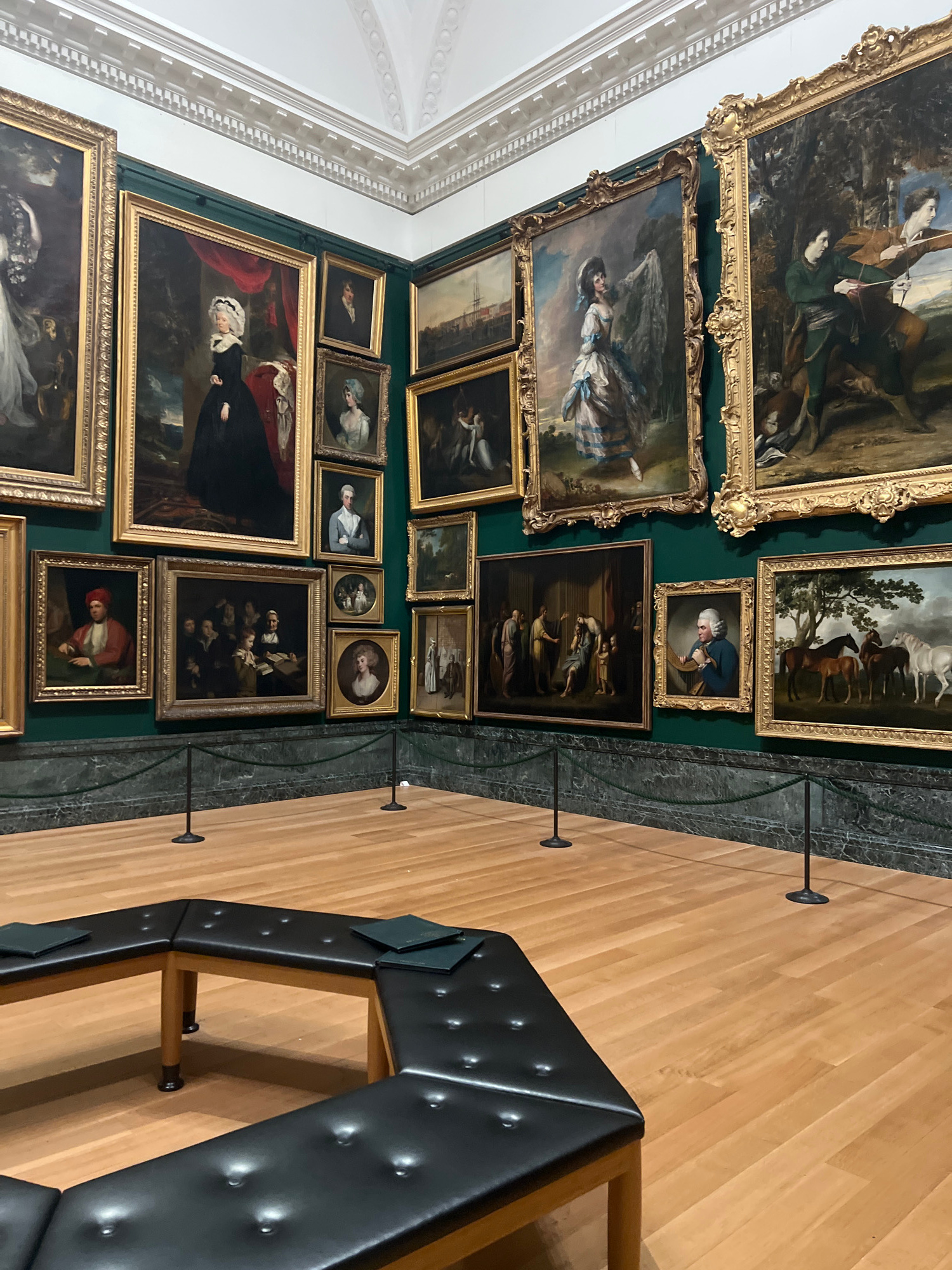The image displays an interior view of an art gallery or museum, with a slightly elevated perspective looking into the room. The walls are painted a dark green, serving as a backdrop for a densely hun…read more