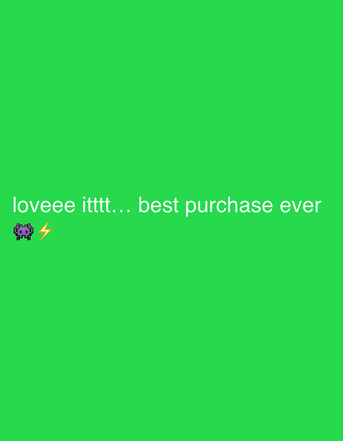 The image is a green background with the text "loveee itttt... best purchase ever" written in white at the bottom left. There's a pixelated purple alien-like figure followed by a yellow lightning bolt…read more