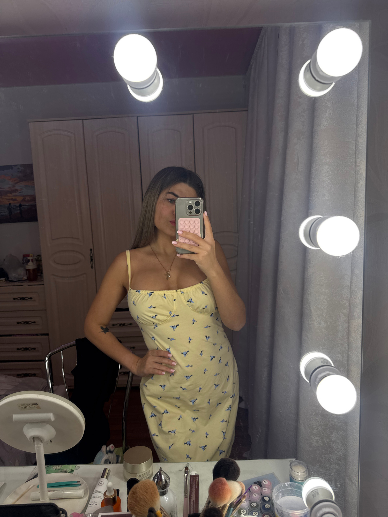 A woman in a yellow floral dress stands in front of a makeup mirror with multiple lights, holding her phone to take a selfie. The mirror is surrounded by makeup and beauty products. The background sho…read more