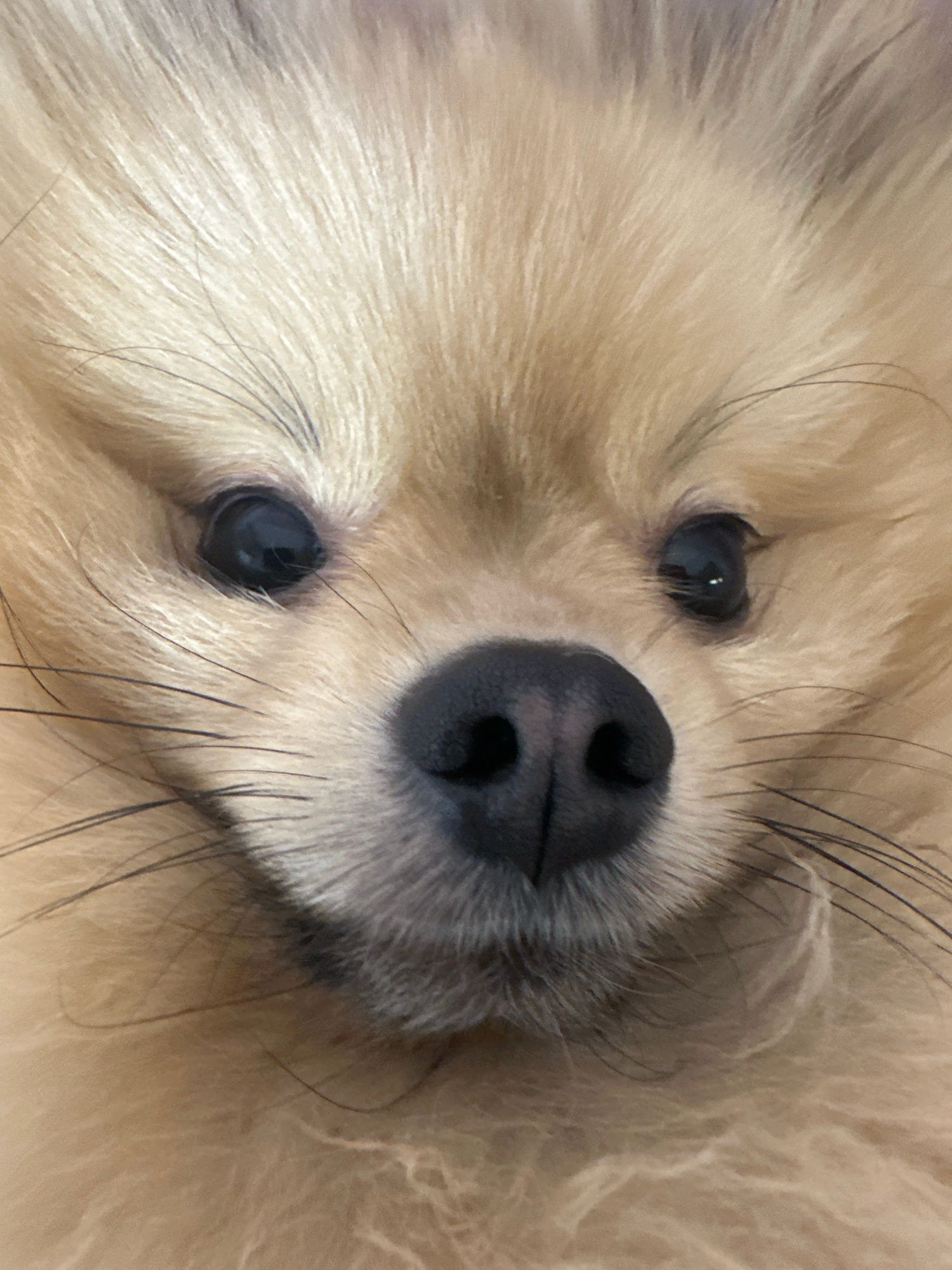 A close-up shot focuses on the face of a light-furred dog, likely a Pomeranian, angled towards the viewer. The dog's black nose is prominent, featuring a distinctive heart-shaped division between the…read more