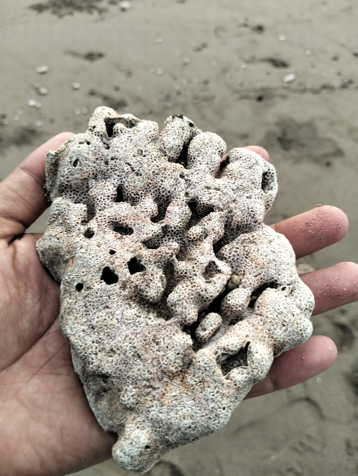A hand holds a piece of coral on a beach. The coral is porous and off-white, with visible holes and textured surfaces. The hand is tanned, with grains of sand on the fingers. The background shows a sa…read more