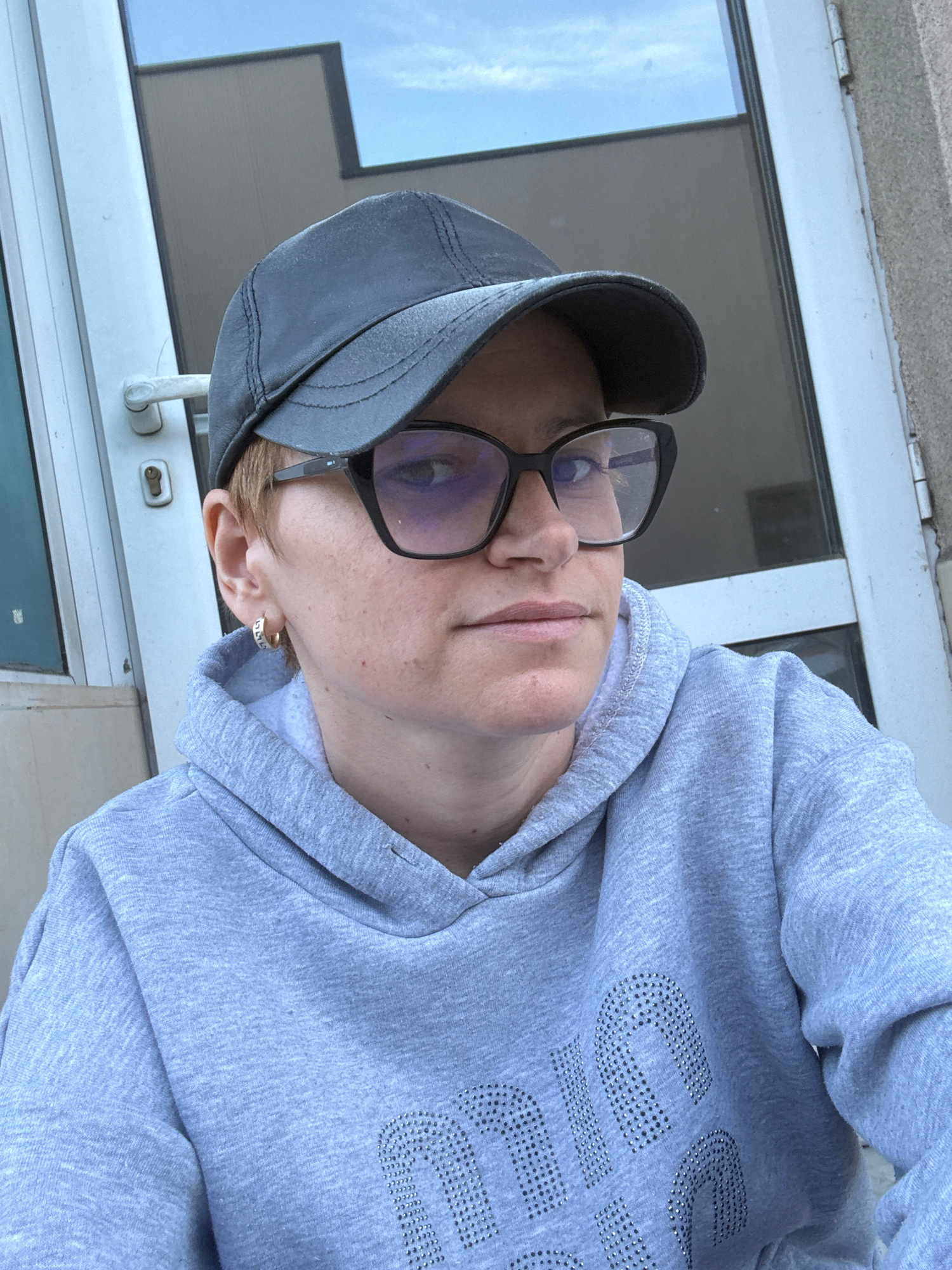 A headshot of an individual wearing a grey hooded sweatshirt with rhinestone embellishments, a dark visor, and glasses. The background shows a white window frame. The city and location are unknown.