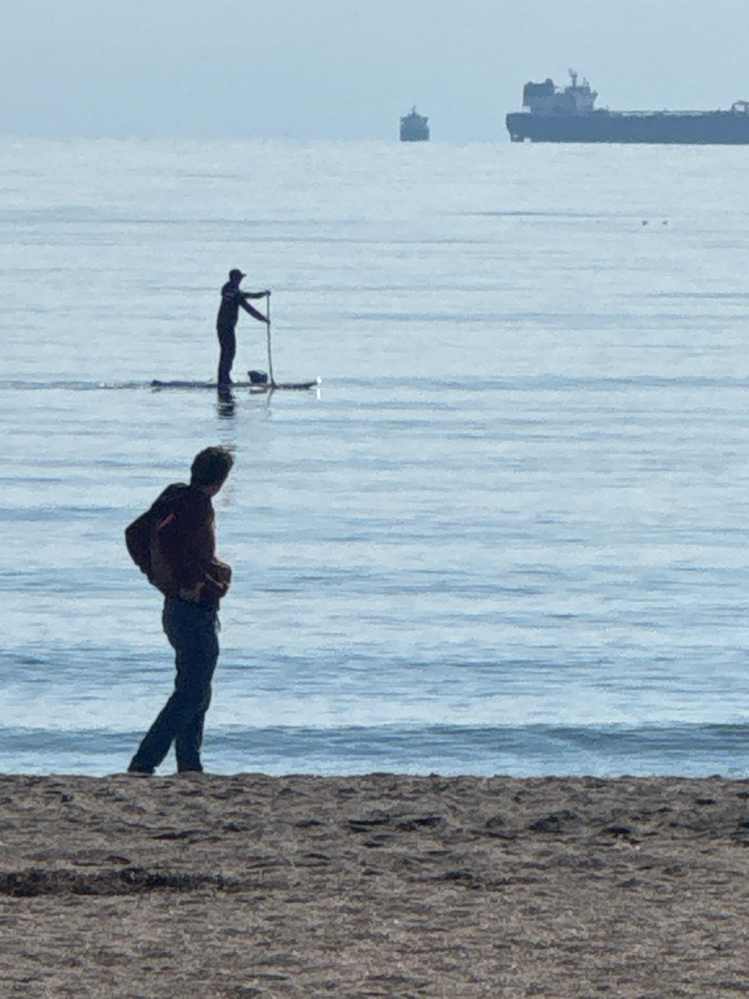 The image shows a man on a slackline over water, presumably the Black Sea, in Burgas, Bulgaria. He is wearing dark pants and a darker short-sleeved shirt. A second person, likely an aerialist, is hang…read more