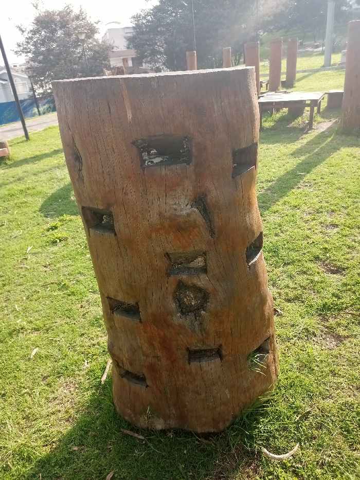 A thick, carved wooden stump stands in a grassy field. Square and rectangular holes punctuate its surface, some filled with dark, possibly resinous material. In the background, more wooden structures…read more