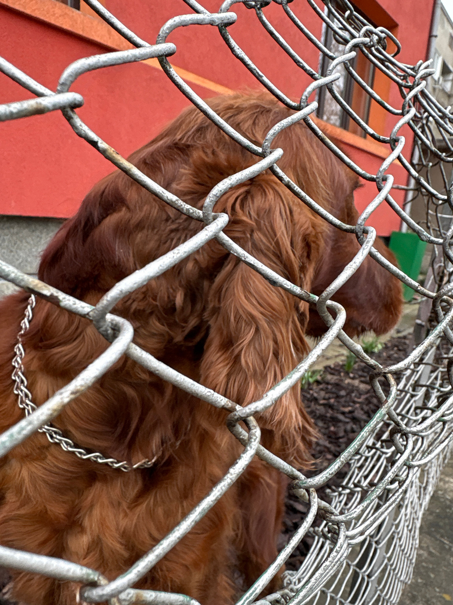 An Irish Setter with a silver chain collar is behind a chain-link fence. In the background are indistinct urban features. The red structure suggests an urban setting and the image may be taken in Trya…read more