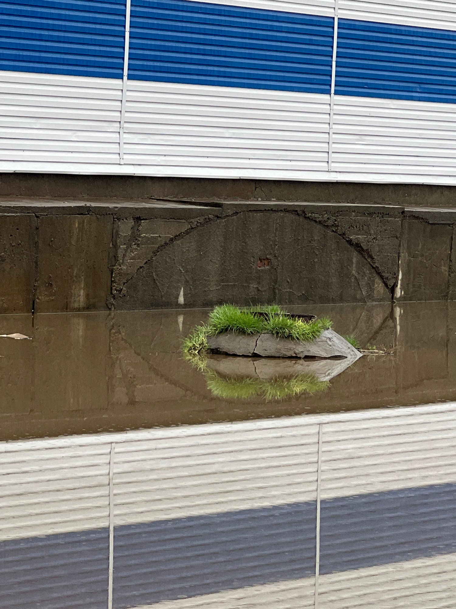 The image, taken from a high angle in Chaikovsky, Russia, depicts a narrow channel between two structures with corrugated metal siding, likely roofs or walls, flanking a dark ground surface. On the le…read more