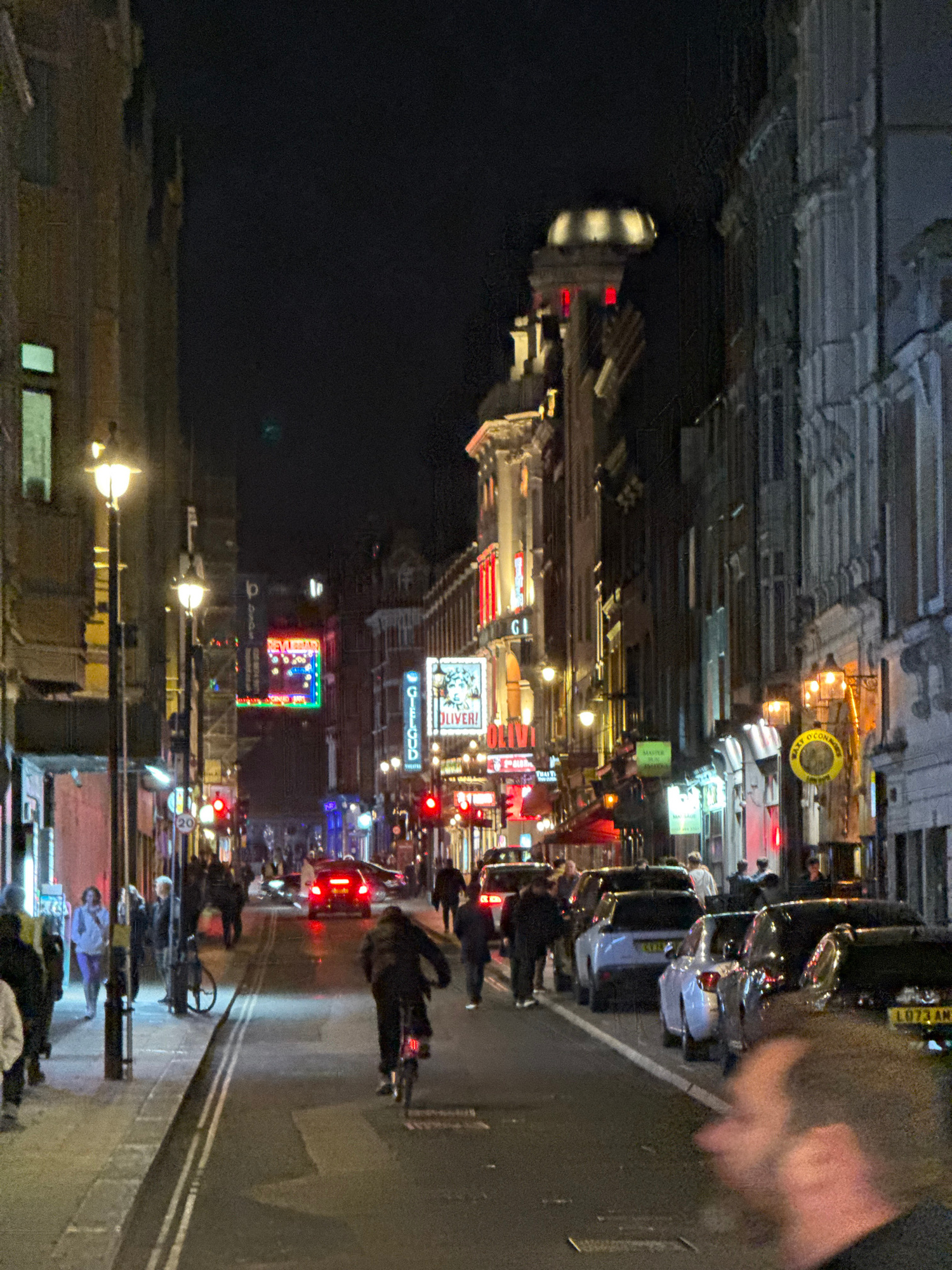 This nighttime street scene shows a bustling street in London, United Kingdom. The camera angle is rotated to the left. People on foot and bicycles share the road with cars, their lights reflecting on…read more