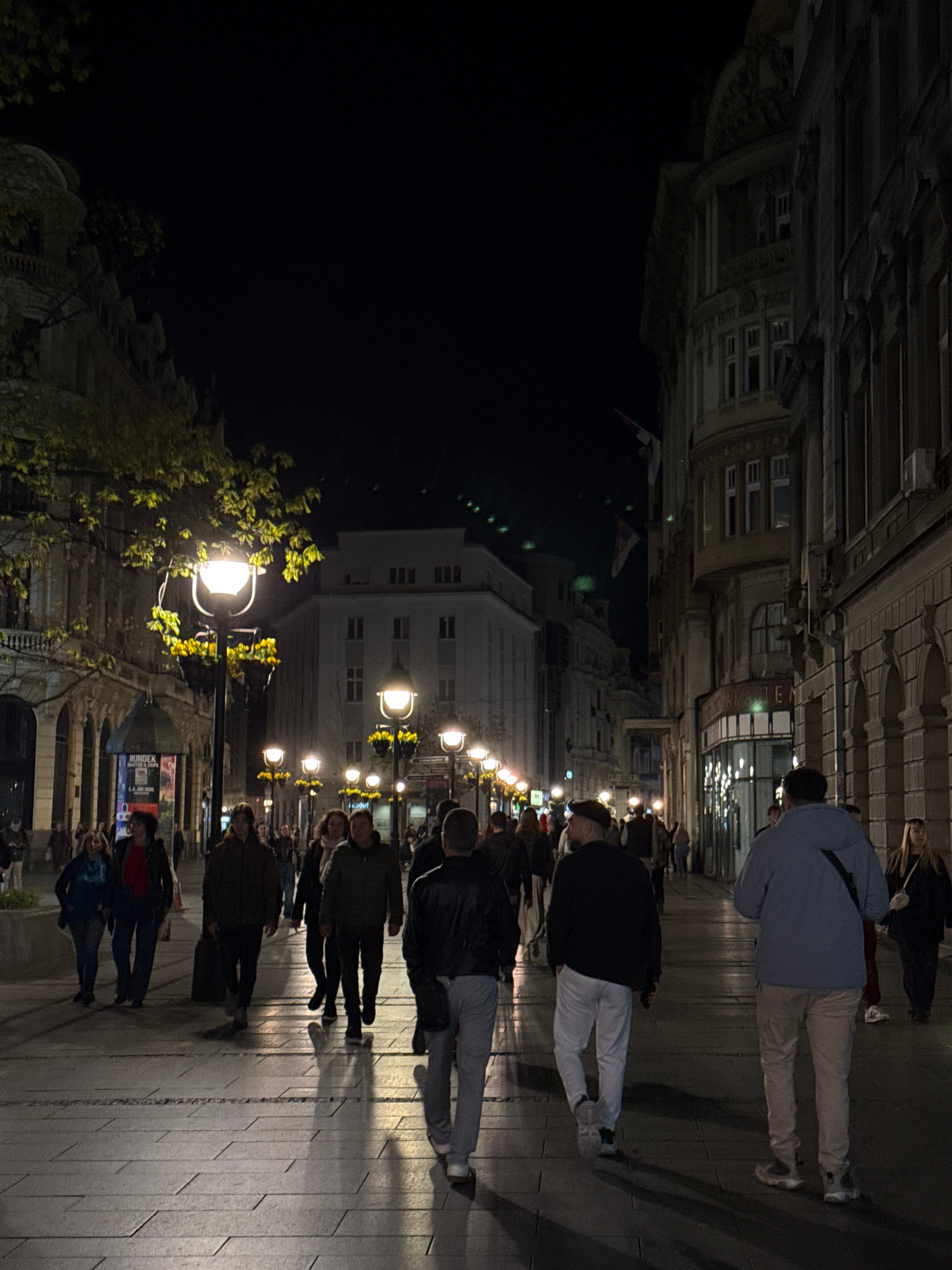A nighttime urban scene depicts a bustling pedestrian street in Belgrade, Serbia, illuminated by decorative streetlights. A crowd of people stroll along the brick-paved walkway. Buildings line the str…read more