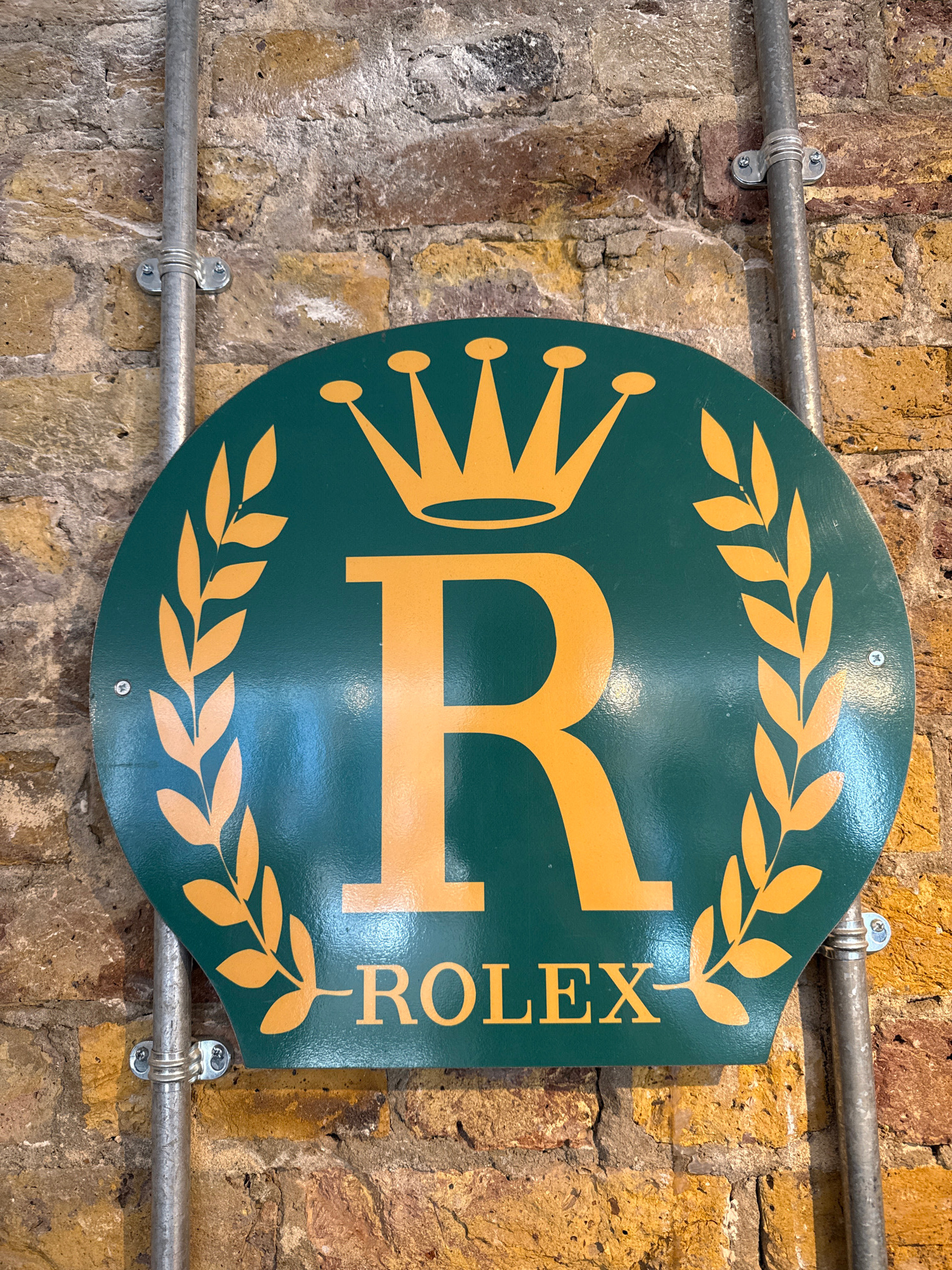 The image depicts a Rolex sign mounted on a brick wall. The sign is circular with a flat top. It's dark green with a gold-colored laurel wreath design around the top and bottom. A large gold-colored lā¦read more