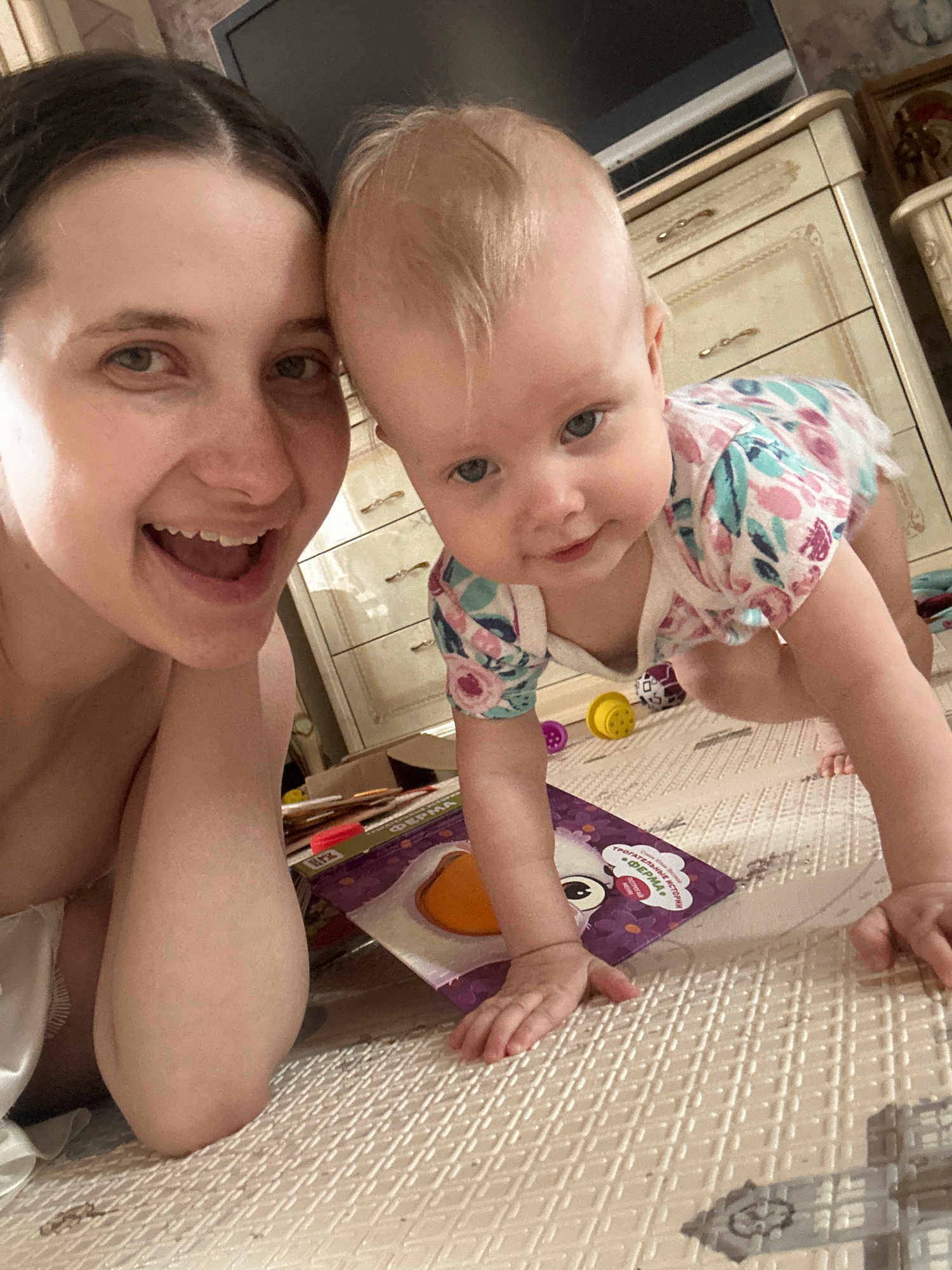A woman and a baby are posing for a selfie. They are indoors, lying on a white textured playmat with grey outlines. The baby, wearing a floral patterned outfit, is positioned above the woman, their he…read more