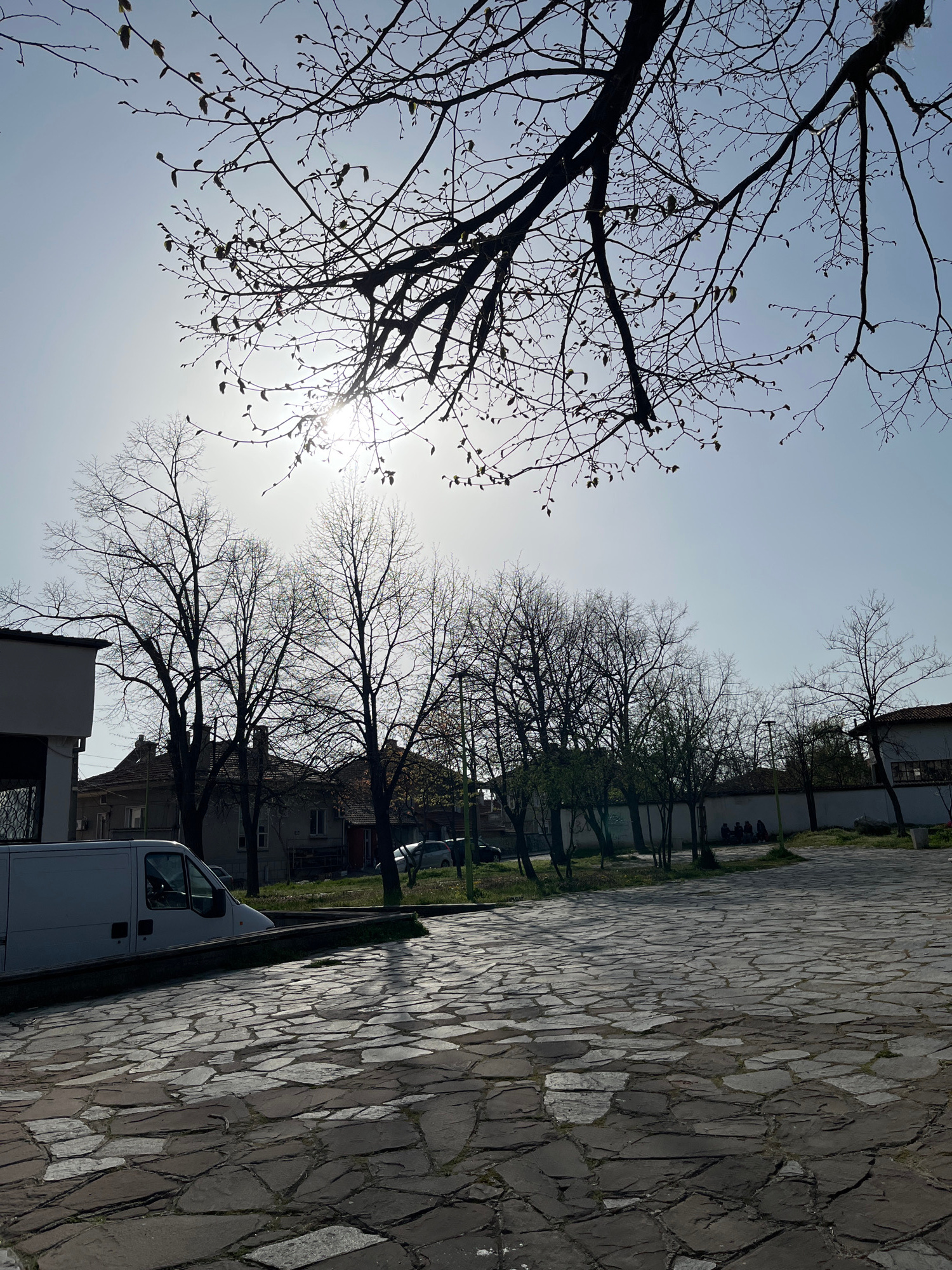 The image depicts a street scene in Sopot, Bulgaria. A foreground tree with bare branches extends across the top left of the frame, obscuring a portion of the bright, sunlit sky. A row of buildings, i…read more