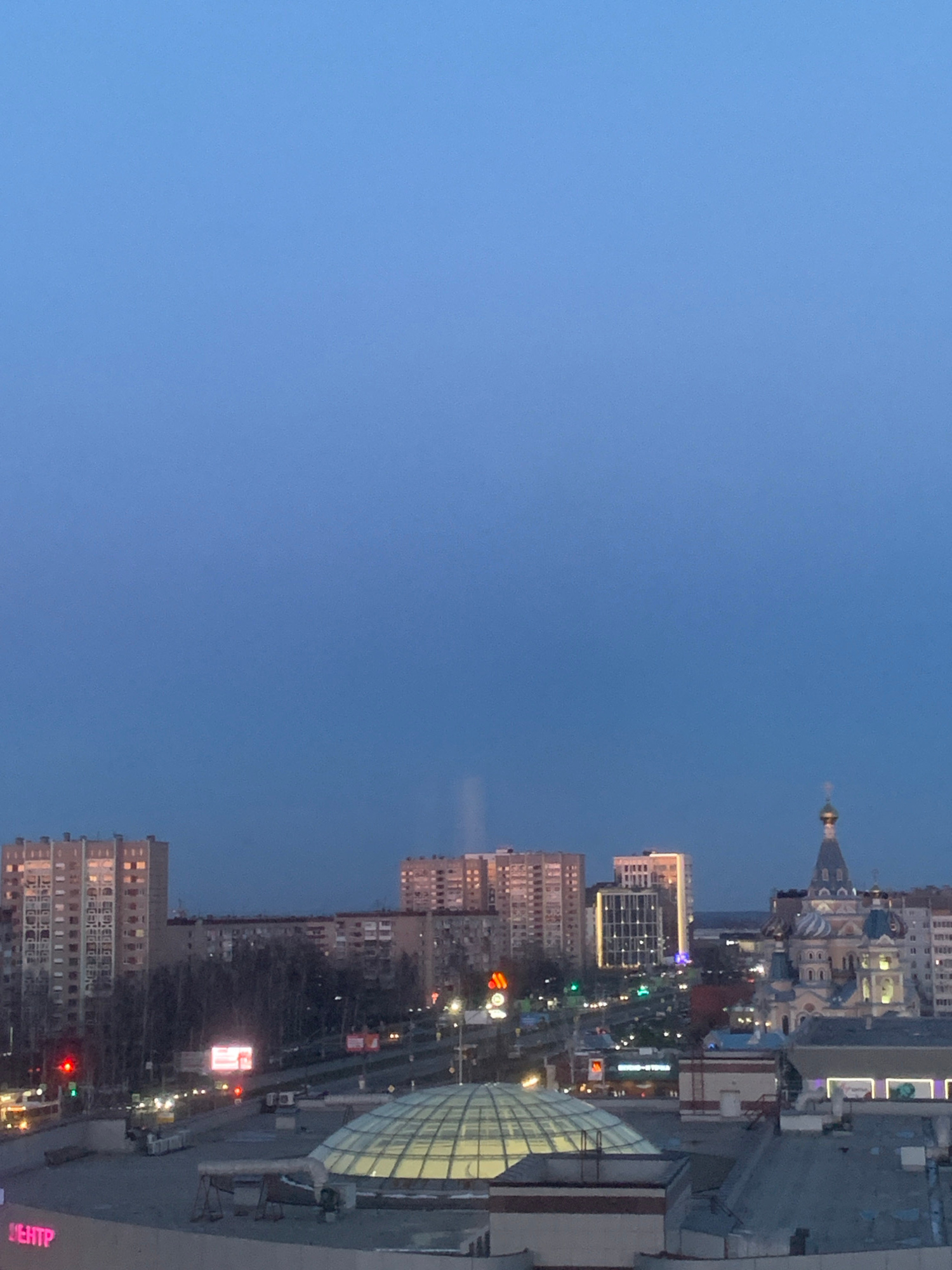 The image shows a partial cityscape of Izhevsk, Russia, at dusk. Dominating the right side are high-rise buildings, including a large shopping center with a glass roof. Further away, a road lined with…read more