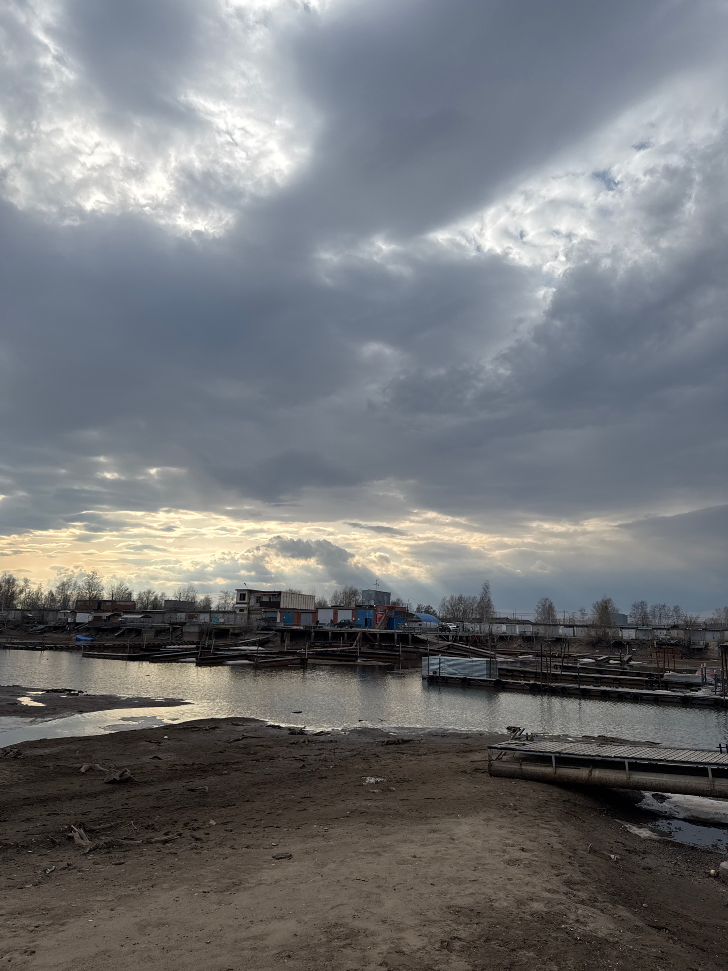 The image depicts a waterfront scene in Chaikovsky, Russia under a dramatic sky. Heavy, gray clouds dominate the upper portion of the frame, with patches of bright, filtered sunlight breaking through,…read more