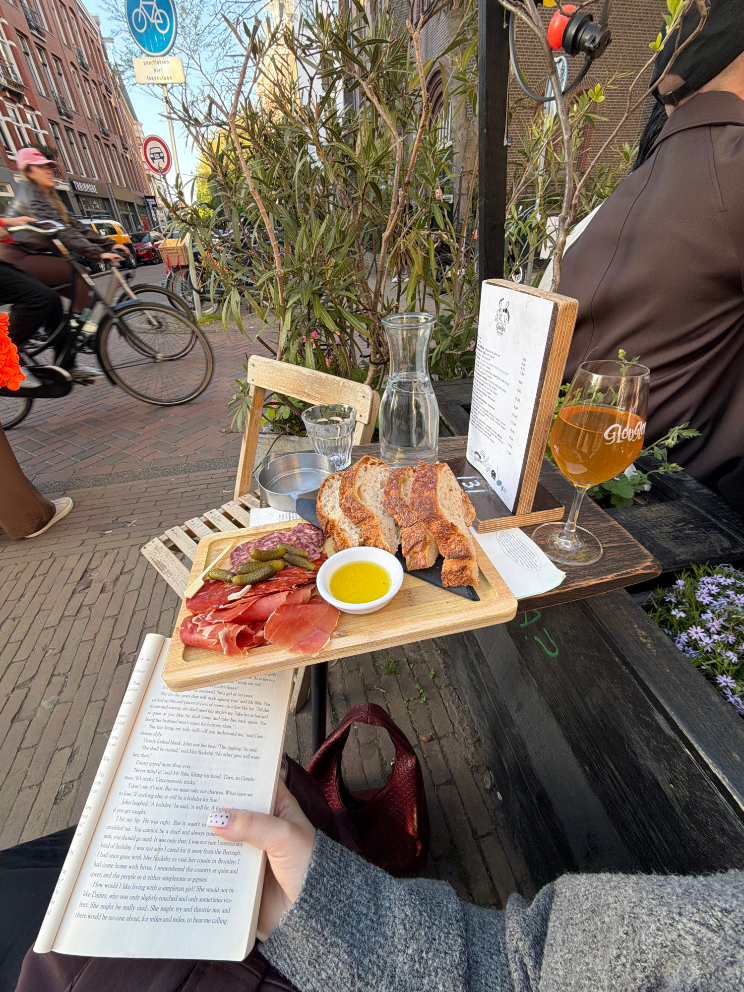 A woman sits outside at a cafe in Amsterdam, Netherlands, reading a book with a wooden charcuterie board and glass of cider in front of her. On the table also sits a glass water bottle. Bicycles pass…read more