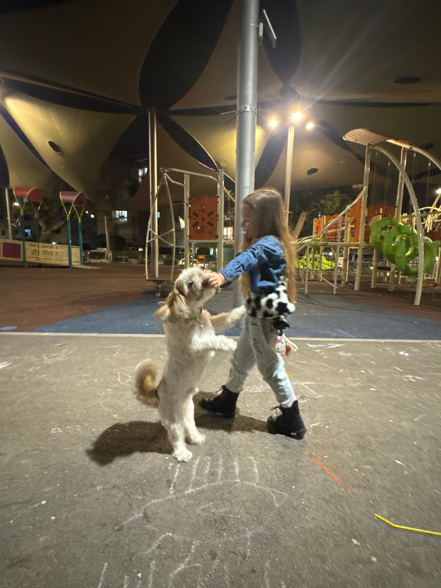 The image, taken in Bat Yam, Israel, depicts a child interacting with a small dog. The child, wearing a denim jacket, light-colored pants, and black boots, stands on a paved surface with chalk markingβ¦read more