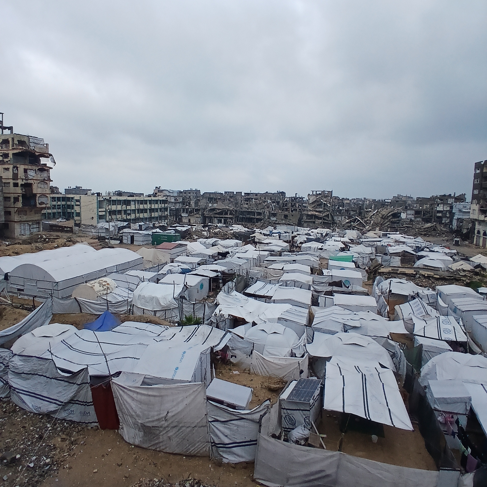 This image captures an extensive temporary settlement, identified as a refugee camp, situated in the city of Gaza, Palestinian Territory, against a backdrop of severely damaged urban infrastructure un…read more